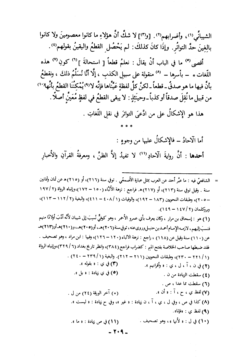 الشيباني وأضرابهم ولا شك أن هؤلاء ما كانوا معصومين ولا كانوا بالغين حد التواتر وإذا كان كذلك لم يحصل القطع واليقين بقولهم أقصى ما في الباب أن يقال نعلم قطعا استحالة كون هذه اللغات بأسرها منقولة على سبيل الكذب إلا أنا نسلم ذلك ونقطع بأن فيها ما هو صدق قطعا لكن كل لفظة عيناها فإنه لا يمكننا القطع بأنها من قبيل ما نقل صدقا أو كذبا وحينئذ لا يبقى القطع في لفظ معين أصلا هذا هو الاشكال على من ادعى التواتر في نقل اللغات أما الآحاد فالاشكال عليها من وجوه أحدها أن رواية الآحاد لا تفيد إلا الظن ومعرفة القرآن والأخبار
