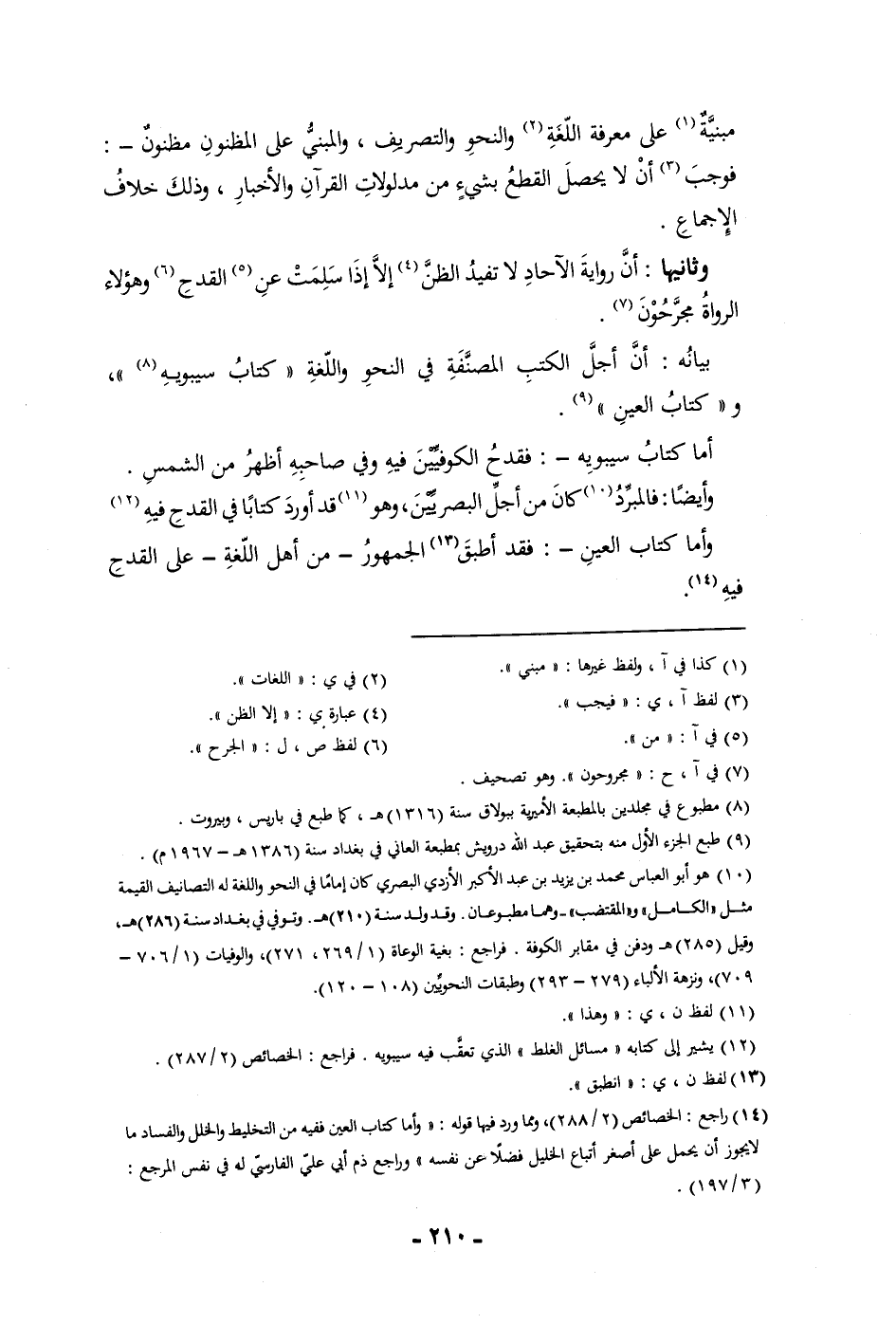 مبنية على معرفة اللغة والنحو والتصريف والمبني على المظنون مظنون فوجب أن لا يحصل القطع بشئ من مدلولات القرآن والاخبار وذلك خلاف الاجماع وثانيها أن رواية الآحاد لا تفيد الظن إلا إذا سلمت عن القدح وهؤلاء الرواة مجرحون فإن بيانه أن أجل الكتب المصنفة في النحو واللغة كتاب سيبويه وكتاب العين أما كتاب سيبويه فقدح الكوفيين فيه وفي صاحبه أظهر من الشمس وأيضا فالمبرد عمر كان من أجل البصريين وهو قد أورد كتابا في القدح فيه