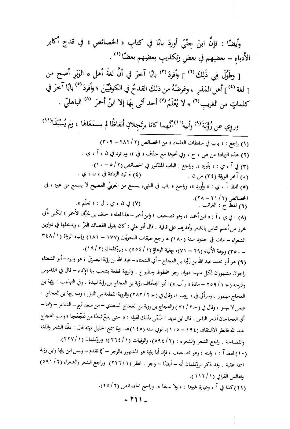 وأيضا فإن ابن جني أورد بابا في كتاب الخصائص في قدح أكابر الأدباء بعضهم في بعض وتكذيب بعضهم بعضا وطول في ذلك وأفرد بابا آخر في أن لغة أهل الوبر أصح من لغة أهل المدر وغرضه من ذلك القدح في الكوفيين وأفرد بابا آخر في كلمات الغريب لا يعلم أحد اتى بها إلا ابن أحمر الباهلي وروي عن رؤبة وأبيه أنهما كانا يرتجلان النبي ألفاظا لم يسمعاها ولم يسبقا