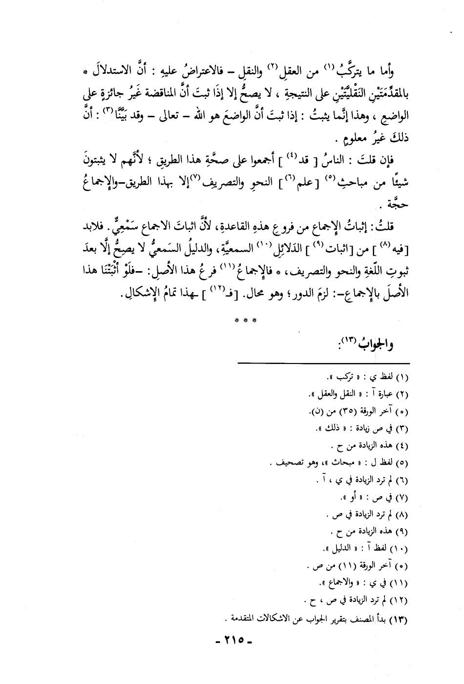 واما ما يتركب من العقل والنقل فالاعتراض عليه أن الاستدلال بالمقدمتين النقليتين على النتيجة لا يصح إلا إذا ثبت أن المناقضة غير جائزة على الواضع وهذا إنما يثبت اذا ثبت أن الواضع هو الله تعالى وقد بينا أن ذلك غير معلوم فان قلت الناس قد أجمعوا على صحة هذا الطريق لأنهم لا يثبتون شيئا من مباحث علم النحو والتصريف إلا بهذا الطريق والاجماع حجة قلت اثبات الاجماع من فروع هذه القاعدة لأن اثبات الاجماع سمعي فلا بد فيه من اثبات الدلائل السمعية والدليل السمعي لا يصح إلا بعد ثبوت اللغة والنحو والتصريف فالإجماع فرع هذا الأصل فلو أثبتنا هذا الأصل بالاجماع لزم الدور وهو محال فهذا تمام الإشكال والجواب