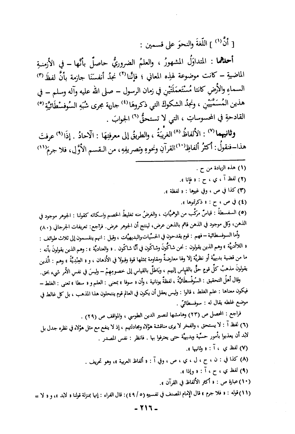 أن اللغة والنحو على قسمين أحدهما المتداول المشهور والعلم الضروري حاصل بأنها في الأزمنة الماضية كانت موضوعة لهذه المعاني فإننا نجد أنفسنا جازمة بأن لفظ السماء والأرض كانتا مستعملتين في زمان الرسول صلى الله عليه وسلم في هذين المسميين ونجد الشكوك التي ذكروها جارية مجرى شبه السوفسطائية القادحة في المحسوسات التي لا تستحق الجواب وثانيهما الألفاظ الغريبة والطريق إلى معرفتها الآحاد إذا عرفت