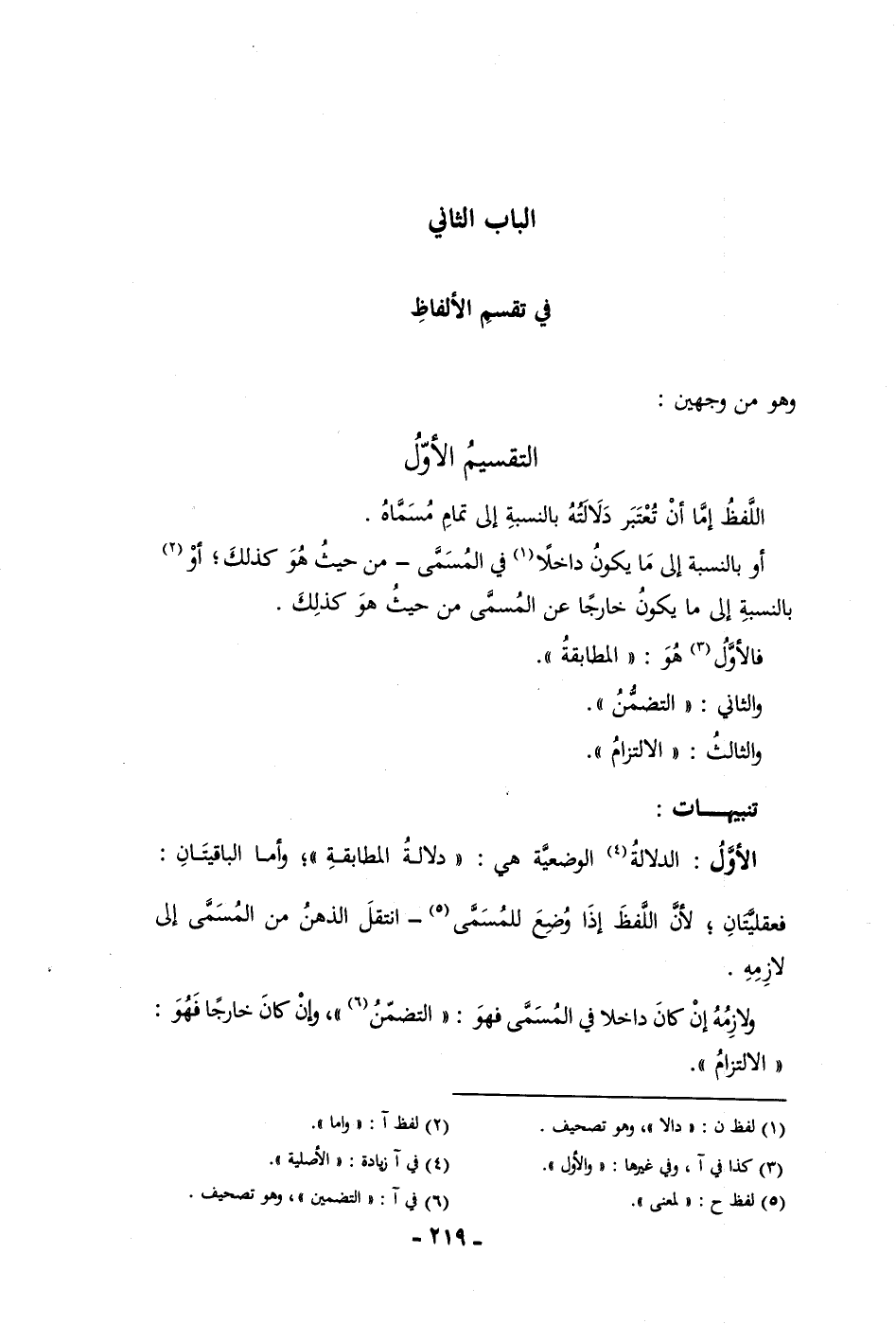 الباب الثاني في تقسيم الألفاظ وهو من وجهين التقسيم الأول اللفظ إما أن تعتبر دلالته بالنسبة إلى تمام مسماه أو بالنسبة إلى ما يكون داخلا في المسمى من حيث هو كذلك أو بالنسبة إلى ما يكون خارجا عن المسمى من حيث هو كذلك فالأول هو المطابقة والثاني التضمن والثالث الالتزام تنبيهات الأول الدلالة الوضعية هي دلالة المطابقة وأما الباقيتان فعقليتان لأن اللفظ إذا وضع للمسمى انتقل الذهن من المسمى إلى لازمه