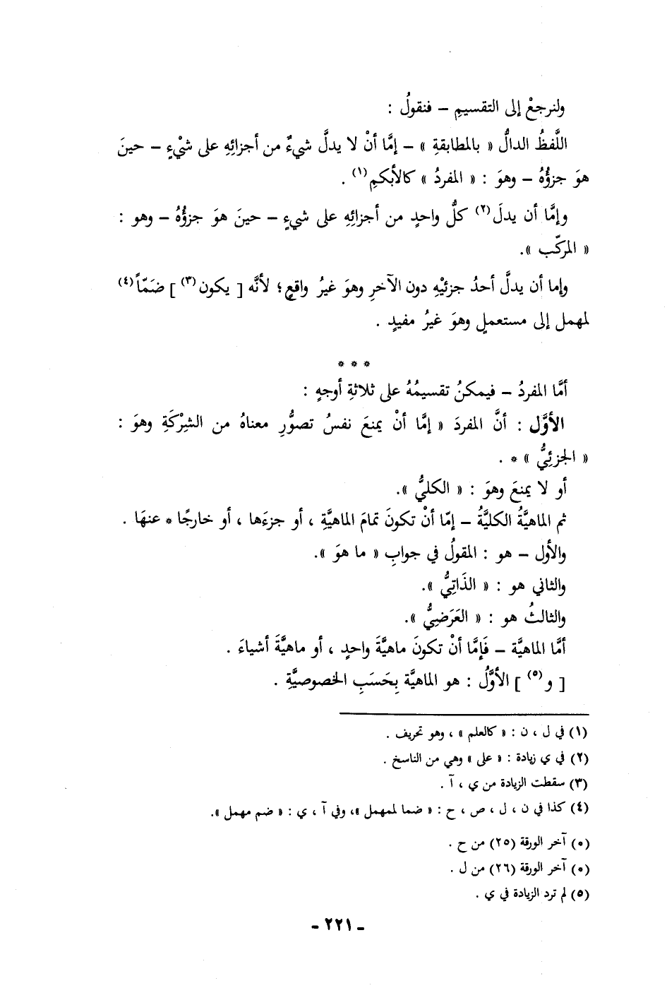ولنرجع إلى التقسيم فنقول اللفظ الدال بالمطابقة إما أن لا يدل شئ من أجزائه على شئ حين هو جزؤه وهو المفرد كالأبكم وإما أن يدل كل واحد من أجزائه على شئ حين هو جزؤه وهو المركب وأما أن يدل أحد جزئيه دون الآخر وهو غير واقع لأنه يكون ضما لمهمل هو إلى مستعمل وهو غير مفيد أما المفرد فيمكن تقسيمه على ثلاثة أوجه الأول أن المفرد إما أن يمنع نفس تصور معناه من الشركة وهو الجزئي