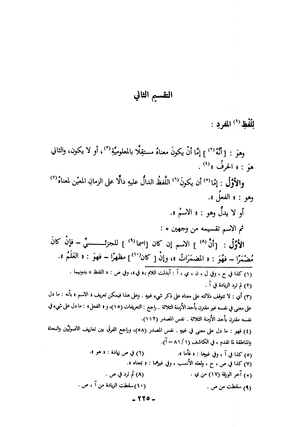 التقسيم الثاني للفظ المفرد وهو أنه إما أن يكون معناه مستقلا بالمعلومية إن أو لا يكون والثاني هو الحرف والأول إما أن يكون اللفظ الدال عليه دالا على الزمان المعين لمعناه وهو الفعل أولا يدل وهو الاسم ثم الاسم تقسيمه من وجهين الأول أن الاسم ان كان اسما للجزئي فإن كان مضمرا فهو المضمرات وإن كان مظهرا فهو العلم