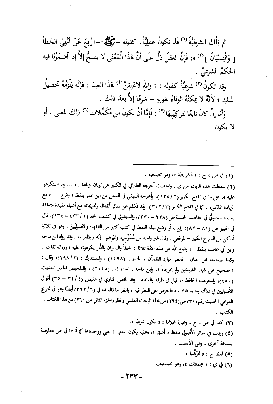 ثم تلك الشرطية قد تكون عقلية كقوله صلى الله عليه وسلم رفع عن أمتي الخطأ والنسيان فإن العقل دل على أن هذا المعنى لا يصح إلا إذا أضمرنا فيه الحم الشرعي وقد تكون شرعية كقوله والله لأعتقن هذا العبد فإنه يلزمه تحصيل الملك لأنه لا يمكنه الوفاء بقوله شرعا إلا بعد ذلك وأما إن كان تابعا لتركيبها أنه فإما أن يكون من مكملات ذلك المعنى أو لا يكون
