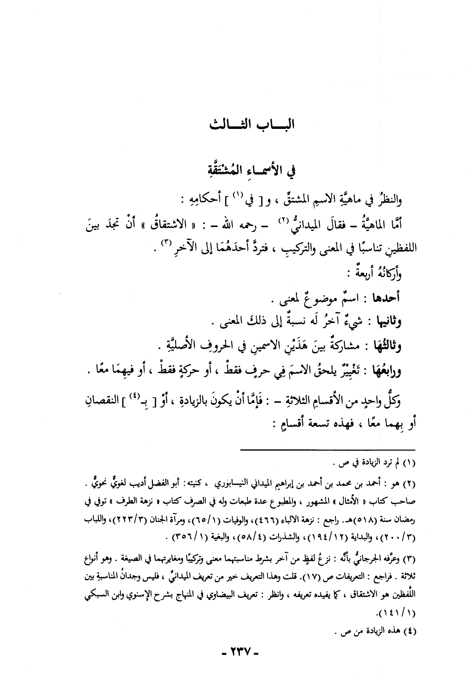 الباب الثالث في الأسماء المشتقة والنظر في ماهية الاسم المشتق وفي أحكامه أما الماهية فقال الميداني رحمه الله الاشتقاق أن تجد بين اللفظين تناسبا في المعنى والتركيب فترد أحدهما إلى الآخر واركانه أربعة أحدها اسم موضوع لمعنى وثانيها شئ آخر له نسبة إلى ذلك المعنى وثالثها مشاركة بين هذين الاسمين في الحروف الأصلية