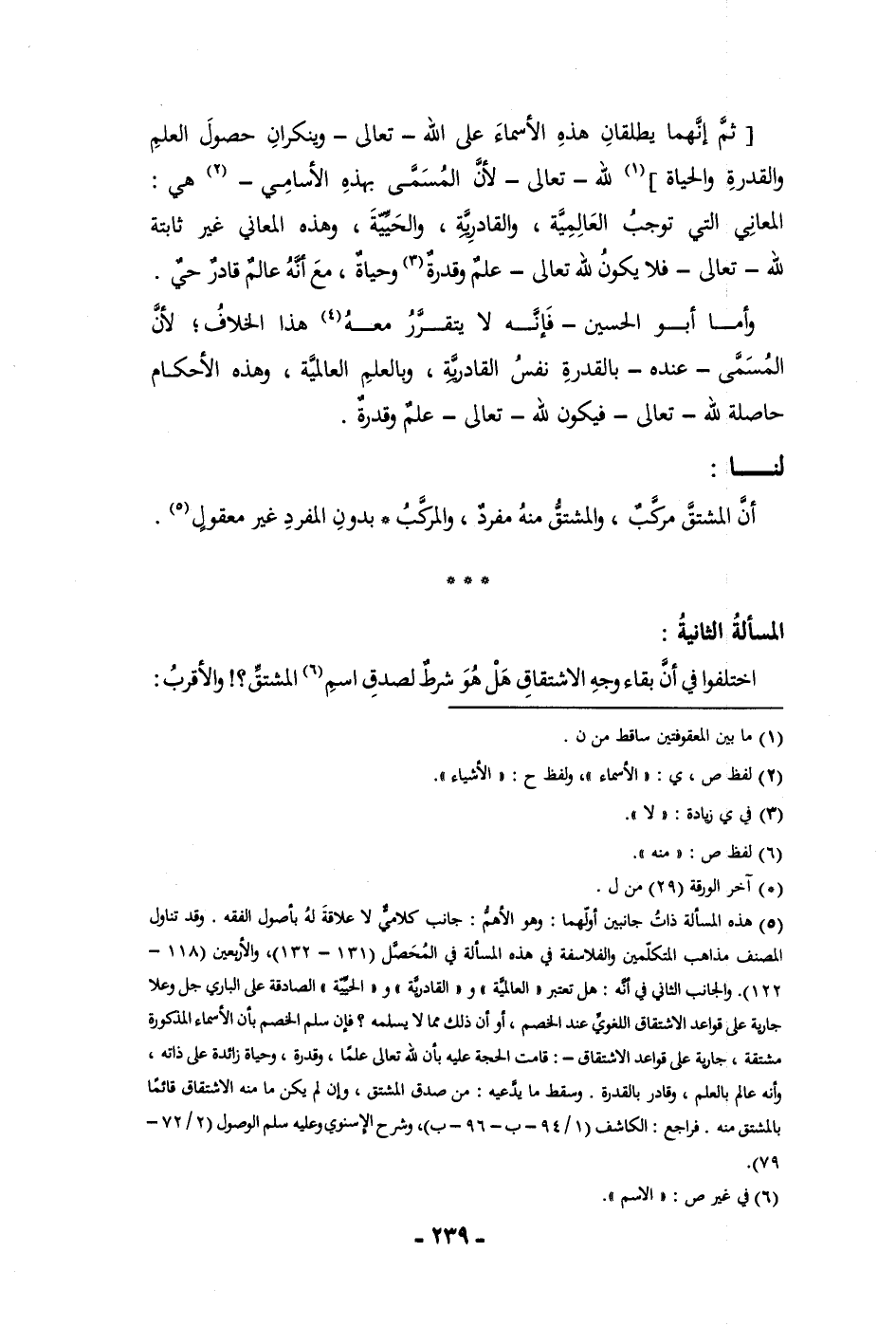 حاصلة لله تعالى فيكون لله تعالى علم وقدرة لنا أن المشتق مركب والمشتق منه مفرد والمركب بدون المفرد غير معقول المسألة الثانية اختلفوا في أن بقاء وجه الاشتقاق هل هو شرط لصدق اسم المشتق والأقرب