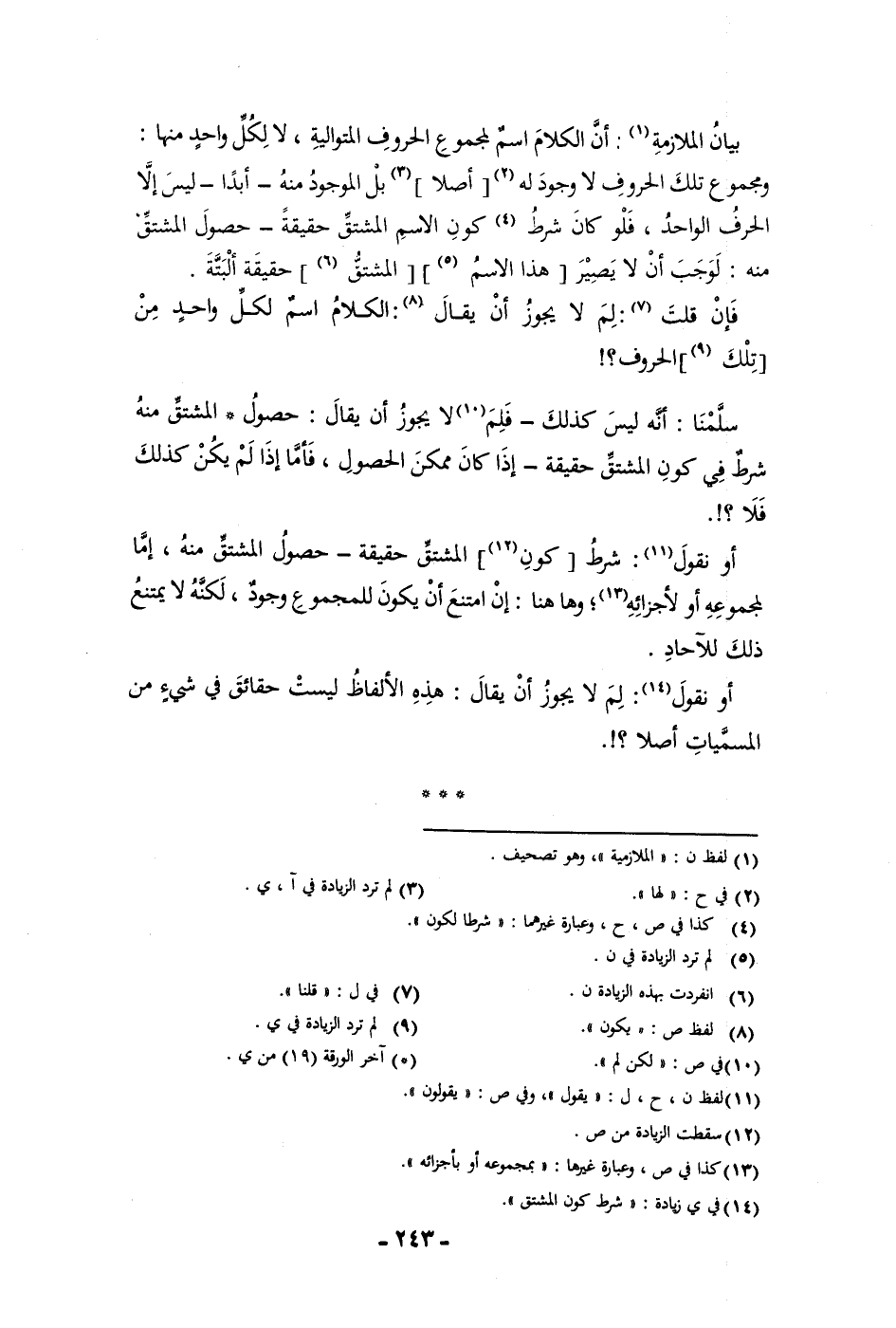 بيان الملازمة أن الكلام اسم لمجموع الحروف المتوالية لا لكل واحد منها ومجموع تلك الحروف لا وجود له أصلا بل الموجود منه أبدا ليس إلا الحرف الواحد فلو كان شرط كون الاسم المشتق حقيقة حصول المشتق منه لوجب أن لا يصير هذا الاسم المشتق حقيقة ألبتة فإن قلت لم لا يجوز أن يقال الكلام اسم لكل واحد من تلك الحروف سلمنا أنه ليس كذلك فلم لا يجوز أن يقال حصول المشتق مه شرط في كون المشتق حقيقة إذا كان ممكن الحصول فأما إذا لم يكن كذلك فلا أو نقول شرط كون المشتق حقيقة حصول المشتق منه إما لمجموعه أو لأجزائه وهاهنا إن امتنع أن يكون للمجموع وجود لكنه لا يمتنع ذلك للآحاد أو نقول لم لا يجوز أن يقال هذه الألفاظ ليست حقائق في شئ من المسميات أصلا