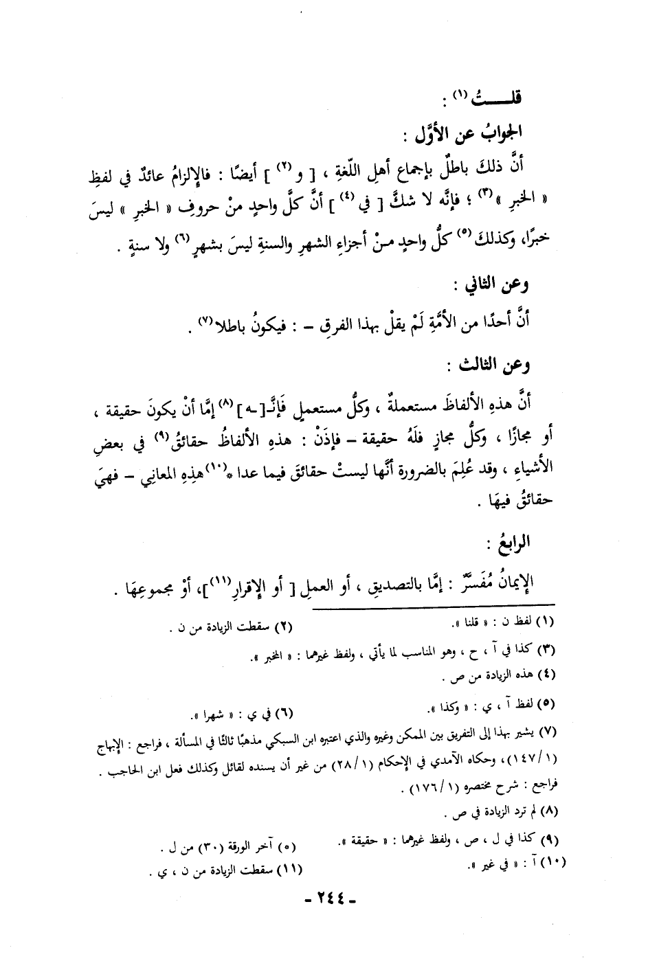قلت الجواب عن الأول أن ذلك باطل باجماع أهل اللغة وأيضا فالالزام عائد في لفظ الخبر فإنه لا شك في أن كل واحد من حروف الخبر ليس خبرا وكذلك كل واحد من أجزاء الشهر والسنة ليس بشهر ولا سنة وعن الثاني أن أحدا من الأمة لم يقل بهذا الفرق فيكون باطلا
