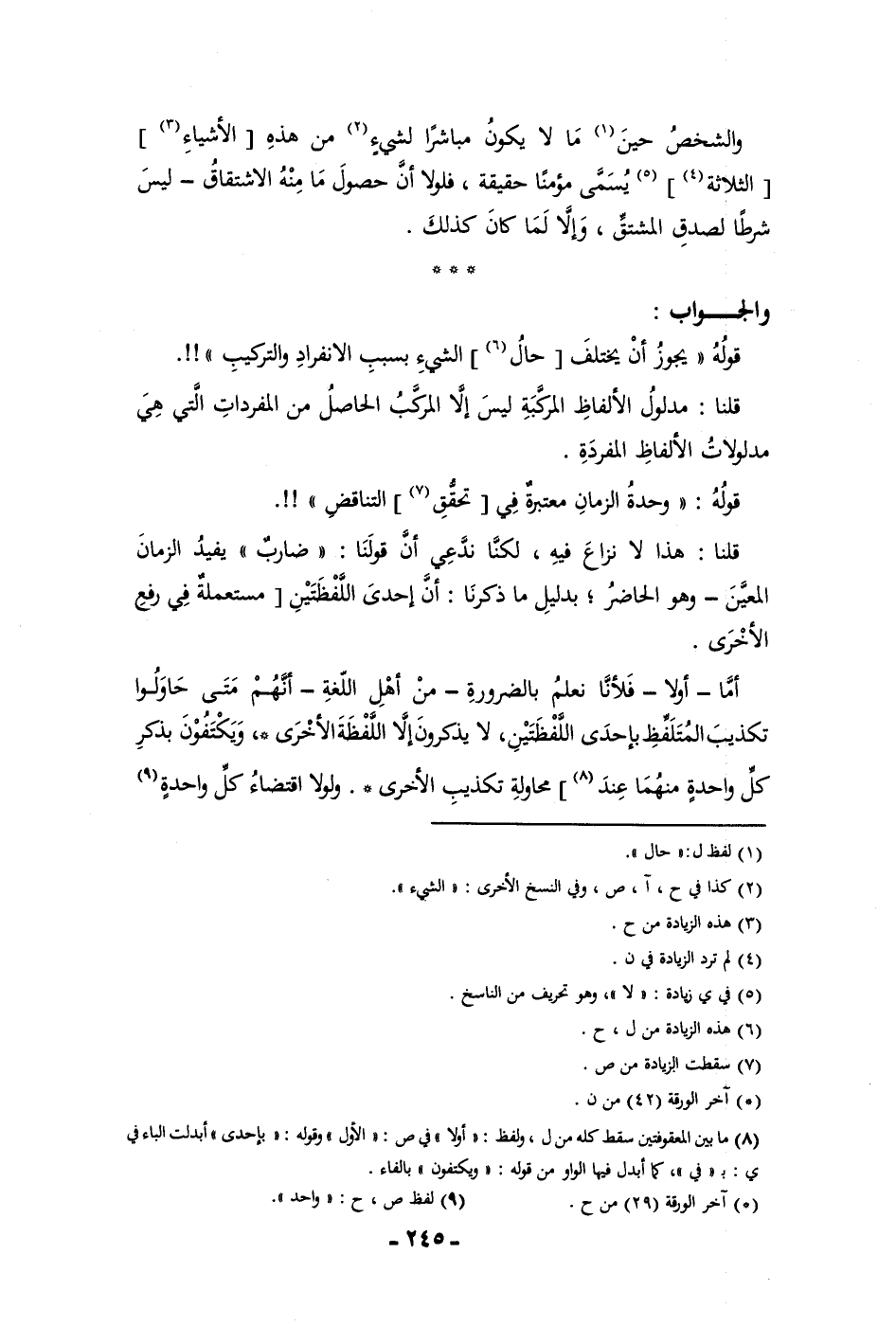 والشخص حين ما لا يكون مباشرا لشئ من هذه الأشياء الثلاثة يسمى مؤمنا حقيقة فلولا أن حصول ما منه الاشتقاق ليس شرطا لصدق المشتق وإلا لما كان كذلك والجواب قوله يجوز أن يختلف حال الشئ بسبب الانفراد والتركيب قلنا مدلول الألفاظ المركبة ليس إلا المركب الحاصل من المفردات التي هي مدلولات الألفاظ المفردة قوله وحدة الزمان معتبرة في تحقق التناقض قلنا هذا لا نزاع فيه لكنا ندعي أن قولنا ضارب يفيد الزمان المعين وهو الحاضر بدليل ما ذكرنا أن إحدى اللفظتين مستعملة في رفع الأخرى أما أولا فلأنا نعلم بالضرورة من أهل اللغة أنهم متى حاولوا تكذيب المتلفظ باحدى اللفظتين لا يذكرون إلا اللفظة الأخرى ويكتفون بذكر كل واحدة منهما عند محاولة تكذيب الأخرى ولولا اقتضاء كل واحدة