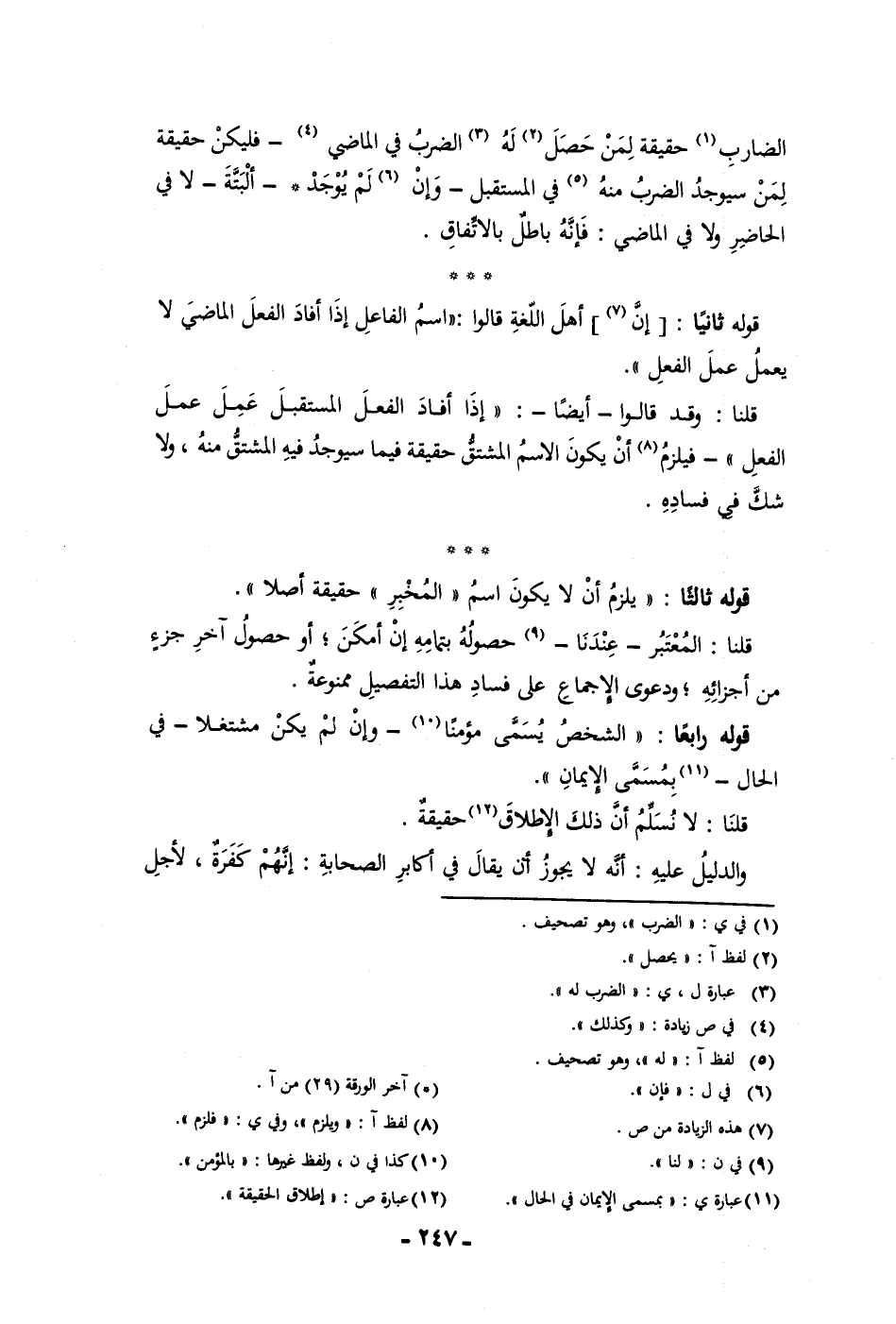 الضارب حقيقة لمن حصل له الضرب في الماضي فليكن حقيقة لمن سيوجد الضرب منه في المستقبل وإن لم يوجد ألبتة لا في الحاضر ولا في الماضي فإنه باطل بالاتفاق قوله ثانيا إن أهل اللغة قالوا اسم الفاعل إذا أفاد الفعل الماضي لا يعمل عمل الفعل قلنا وقد قالوا أيضا إذا أفاد الفعل المستقبل عمل عمل الفعل فيلزم أن يكون الاسم المشتق حقيقة فيما سيوجد فيه المشتق منه ولا