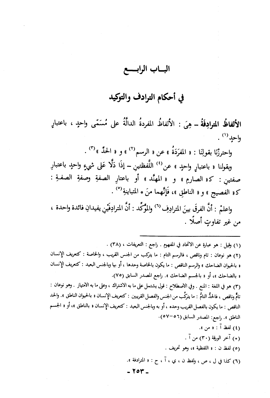 الباب الرابع في أحكام الترادف والتوكيد الألفاظ المترادفة هي الألفاظ المفردة الدالة على مسمى واحد باعتبار واحد واحترزنا بقولنا المفردة عن الرسم والحد وبقولنا باعتبار واحد عن اللفظتين إذا دلا على شئ واحد باعتبار صفتين كصارم والمهند أو باعتبار الصفة وصفة الصفة كالفصيح والناطق فإنهما من المتباينة واعلم أن الفرق بين المترادف والمؤكد أن المترادفين يفيدان فائدة واحدة
