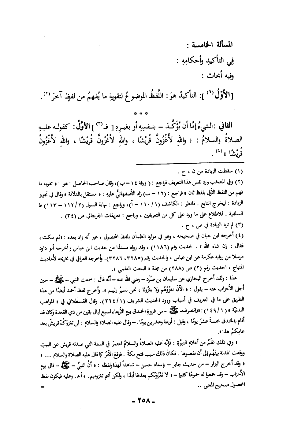 المسألة الخامسة في التأكيد وأحكامه وفيه أبحاث الأول التأكيد هو اللفظ الموضوع لتقوية ما يفهم من لفظ آخر الثاني الشئ إما أن يؤكد بنفسه أو بغيره فالأول كقوله عليه الصلاة والسلام والله لأغزون قريشا والله لأغزون قريشا والله لأغزون قريشا