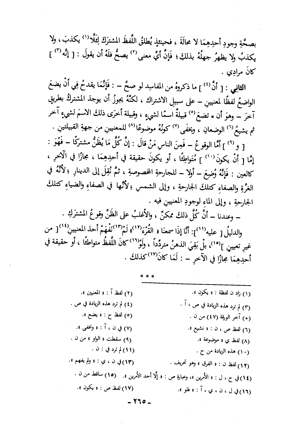 بصحة وجود أحدهما لا محالة فحينئذ يطلق اللفظ المشترك لئلا يكذب ولا يكذب ولا يظهر جهله بذلك فإن أي معنى يصح فله أن يقول إنه كان مرادي الثاني أن ما ذكروه من المفاسد لو صح فإنما يقدح في أن يضع الواضع لفظا لمعنيين على سبيل الاشتراك لكنه يجوز أن يوجد المشترك بطريق آخر وهو أن تضع قبيلة اسما لشئ وقبيلة أخرى ذلك الاسم لشئ آخر ثم يشيع الوضعان ويخفى كونه موضوعا للمعنيين من جهة القبيلتين وأما الوقوع فمن الناس من قال إن كل ما يظن مشتركا فهو إما أن يكون متواطئا أو يكون حقيقة في أحدهما مجازا في الآخر كالعين فإنه وضع أولا للجارحة المخصوصة ثم نقل إلى الدينار لإنه في الغرة والصفاء كتلك الجارحة وإلى الشمس لأنها في الصفاء والضياء كتلك الجارحة وإلى الماء لوجود المعنيين فيه وعندنا أن كل ذلك ممكن والأغلب على الظن وقوع المشترك والدليل عليه أنا إذا سمعنا القرء لم نفهم أحد المعنيين من