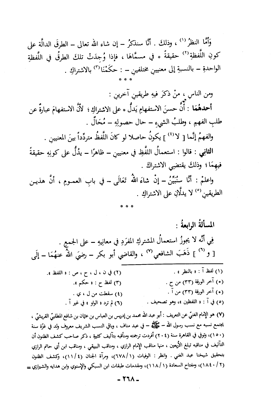 والفهم إنما لا يكون حاصلا لو كان اللفظ مترددا بين المعنيين الثاني قالوا استعمال الفظ في معنيين ظاهرا يدل على كونه حقيقة ف يهما وذلك يقتضي الاشتراك واعلم أنا سنبين إن شاء الله تعالى في باب العموم أن هذين الطريقين لا يدلان على الاشتراك المسألة الرابعة في أنه لا يجوز استعمال المشترك المفرد في معانيه على الجمع وذهب الشافعي والقاضي أبو بكر رضي الله عنهما إلى