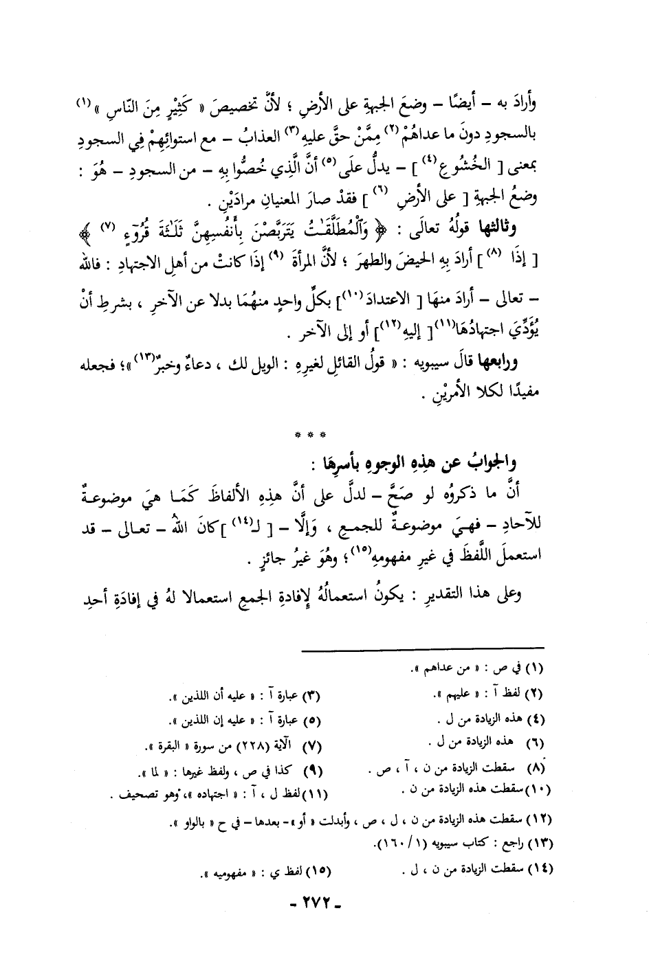 وأراد به أيضا وضع الجبهة على الأرض لأن تخصيص كثير من الناس بالسجود دون ما عداهم ممن حق عليه العذاب مع استوائهم في السجود بمعنى الخشوع يدل على أن الذي خصوا به من السجود هو وضع الجبهة على الأرض فقد صار المعنيان مرادين وثالثها قوله تعالى والمطلقات يتربصن بأنفسهن ثلاثة قروء إذا أراد به الحيض والطهر لأن المرأة إذا كانت من أهل الاجتهاد فالله تعالى أراد منها الاعتداد بكل واحد منهما بدلا عن الآخر بشرط أن يؤدي اجتهادها إليه أو إلى الآخر ورابعها قال سيبويه قول القائل لغيره الويل لك دعاء وخبر فجعله مفيدا لكلا الأمرين والجواب عن هذه الوجوه بأسرها أن ما ذكروه لو صح لدل على أن هذه الألفاظ كما هي موضوعة للآحاد فهي موضوعة للجمع وإلا لكان الله تعالى قد استعمل اللفظ في غير مفهومه وهو غير جائز وعلى هذا التقدير يكون استعماله لإفادة الجمع استعمالا له في إفادة أحد