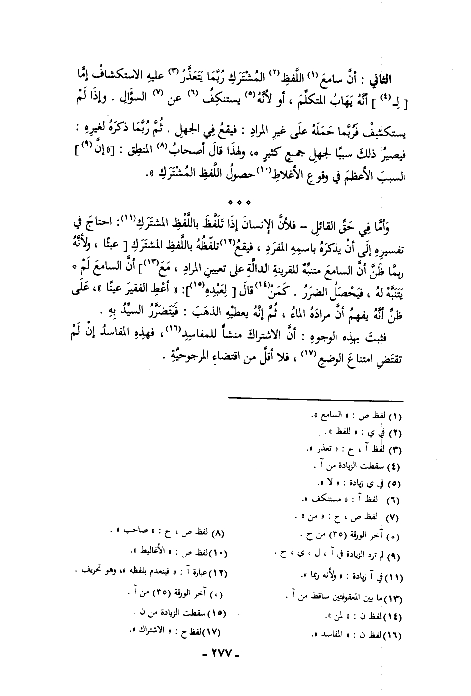 الثاني أن سامع اللفظ المشترك ربما يتعذر عليه الاستكشاف إما لأنه يهاب المتكلم أو لأنه يستنكف عن السؤال وإذا لم يستكشف فربما حمله على غير المراد فيقع في الجهل ثم ربما ذكره لغيره فيصير ذلك سببا لجهل جمع كثير ولهذا قال أصحاب المنطق إن السبب الأعظم في وقوع الأغلاط حصول اللفظ المشترك وأما في حق القائل فلأن الانسان إذا تلفظ باللفظ المشترك احتاج في تفسيره إلى أن يذكره باسمه المفرد فيقع تلفظه باللفظ المشترك عبثا ولأنه ربما ظن أن السامع متنبه للقرينة الدالة على تعيين المراد مع أن السامع لم يتنبه له فيحصل الضرر كمن قال لعبده أعط الفقير عينا على ظن أنه يفهم أن مراده الماء ثم إنه يعطيه الذهب فيتضرر السيد به فثبت بهذه الوجوه أن الاشتراك منشأ للمفاسد فهذه المفاسد إن لم تقتض امتناع الوضع فلا أقل من اقتضاء المرجوحية