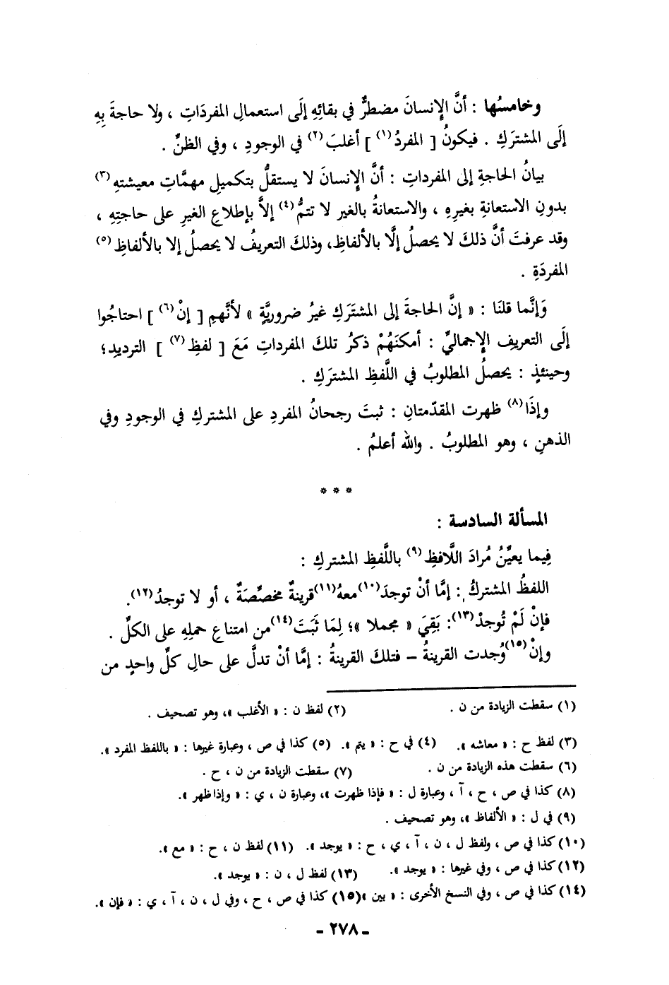 وخامسها أن الانسان مضطر في بقائه إلى استعمال المفردات ولا حاجة به إلى المشترك فيكون المفرد أغلب في الوجود وفي الظن بيان الحاجة إلى المفردات أن الإنسان لا يستقل بتكميل مهمات معيشته بدون الاستعانة بغيره والاستعانة بالغير لا تتم إلا بإطلاع الغير على حاجته وقد عرفت أن ذلك لا يحصل إلا بالألفاظ وذلك التعريف لا يحصل إلا بالألفاظ المفردة وإنما قلنا إن الحاجة إلى المشترك غير ضرورية لأنهم إن احتاجوا إلى التعريف الاجمالي أمكنهم ذكر تلك المفردات مع لفظ الترديد وحينئذ يحصل المطلوب في اللفظ المشترك