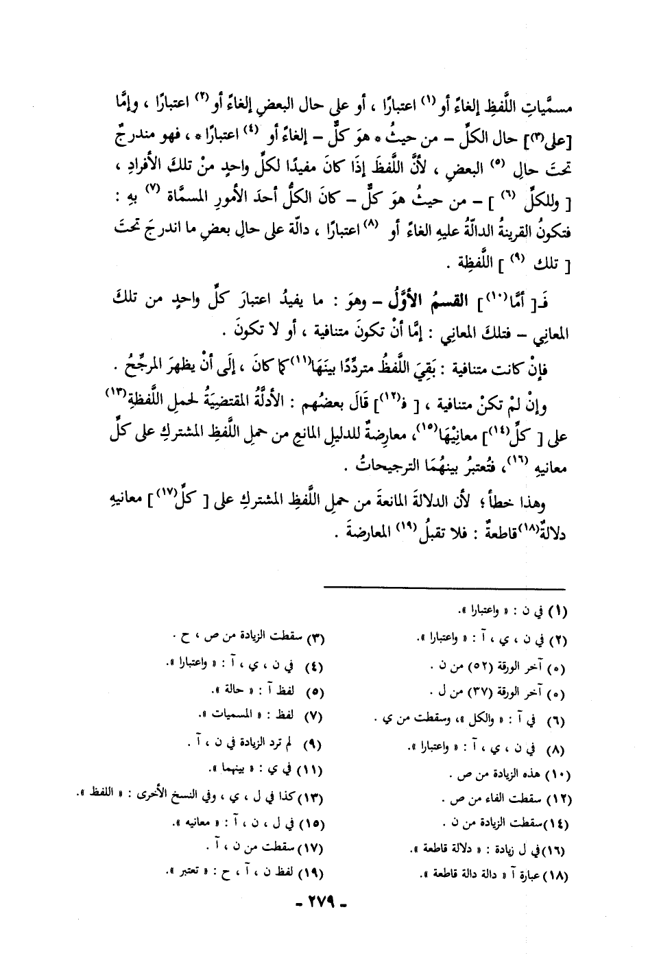 مسميات اللفظ الغاءا أو اعتبارا أو على حال البعض الغاءا أو اعتبارا وإما على حال الكل م حيث هو كل الغاءا أو اعتبارا فهو مندرج تحت حال البعض لأن اللفظ إذا كان مفيدا لكل واحد من تلك الأفراد وللكل من حيث هو كل كان الكل أحد الأمور المسماة به فتكون القرينة الدالة عليه الغاءا أو اعتبارا دالة على حال بعض ما اندرج تحت تلك اللفظة ف أما القسم الأول وهو ما يفيد اعتبار كل واحد من تلك المعاني فتلك المعاني إما أن تكون متنافية أو لا تكون فان كانت متنافية بقي اللفظ مترددا بينها كما كان إلى أن يظهر المرجح وإن لم تكن متنافية ف قال بعضهم الأدلة المقتضية لحمل اللفظة على كل معانيها معارضة للدليل المانع من حمل اللفظ المشترك على كل معانيه فتعتبر بينهما الترجيحات وهذا خطأ لأن الدلالة المانعة من حمل اللفظ المشترك على كل معانيه دلالة قاطعة فلا تقبل المعارضة