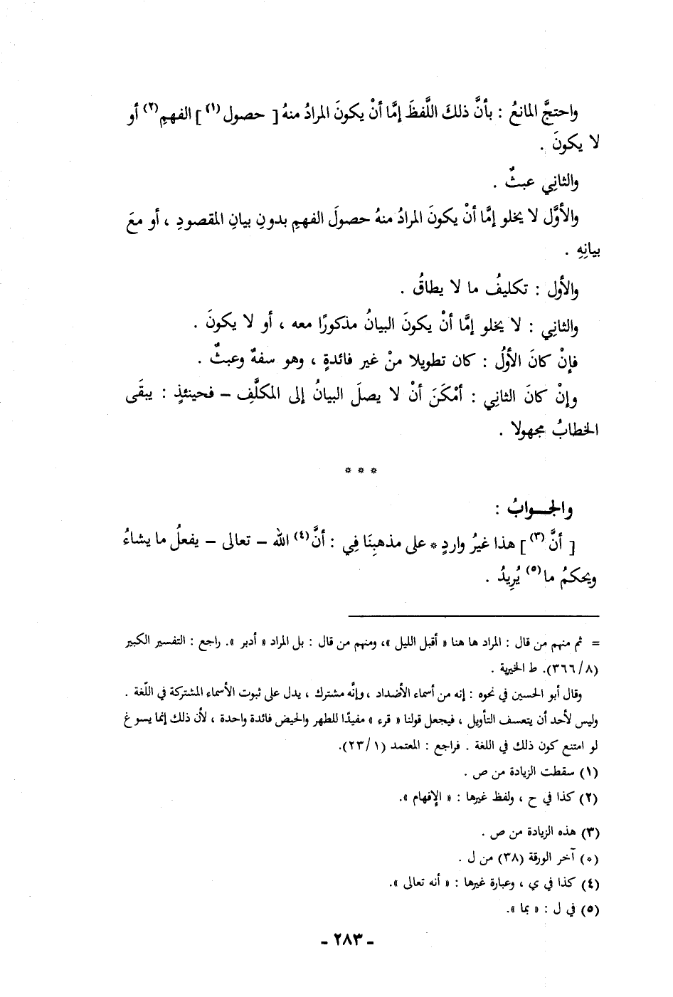 واحتج المانع بأن ذلك اللفظ إما أن يكون المراد منه حصول الفهم أو لا يكون والثاني عبث والأول لا يخلو إما أن يكون المراد منه حصول الفهم بدون بيان المقصود أو مع بيانه والأول تكليف ما لا يطاق والثاني لا يخلو إما أن يكون البيان مذكورا معه أو لا يكون فإن كان الأول كان تطويلا من غير فائدة وهو سفه وعبث وإن كان الثاني أمكن أن لا يصل البيان إلى المكلف فحينئذ يبقى الخطاب مجهولا والجواب أن هذا غير وارد على مذهبنا في أن الله تعالى يفعل ما يشاء ويحكم ما يريد