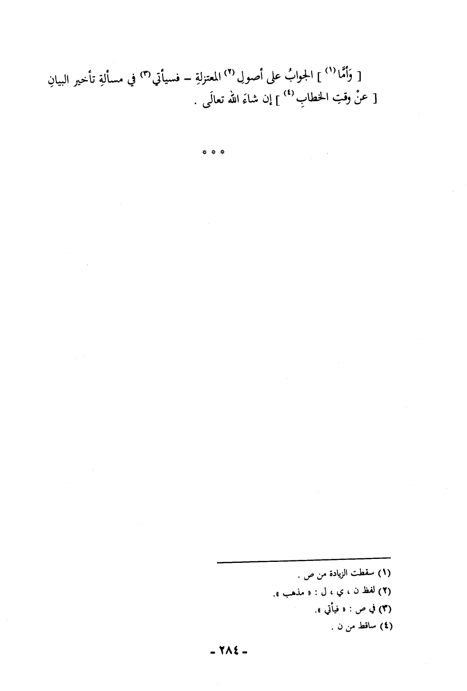 وأما الجواب على أصول المعتزلة فسيأتي في مسألة تأخير البيان عن وقت الخطاب ان شاء الله تعالى