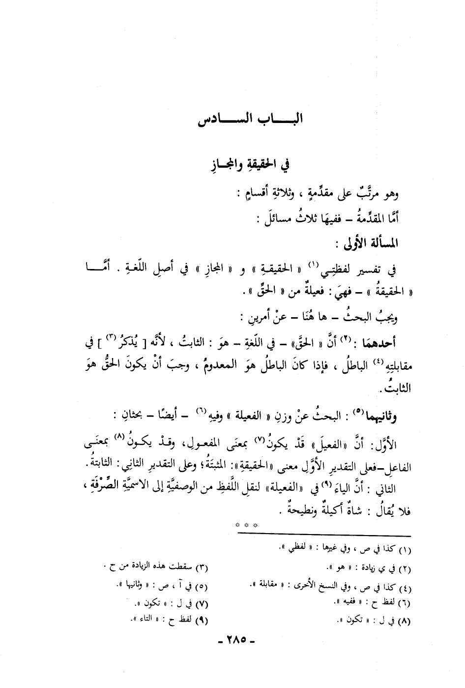 الباب السادس في الحقيقة والمجاز وهو مرتب على مقدمة وثلاثة أقسام