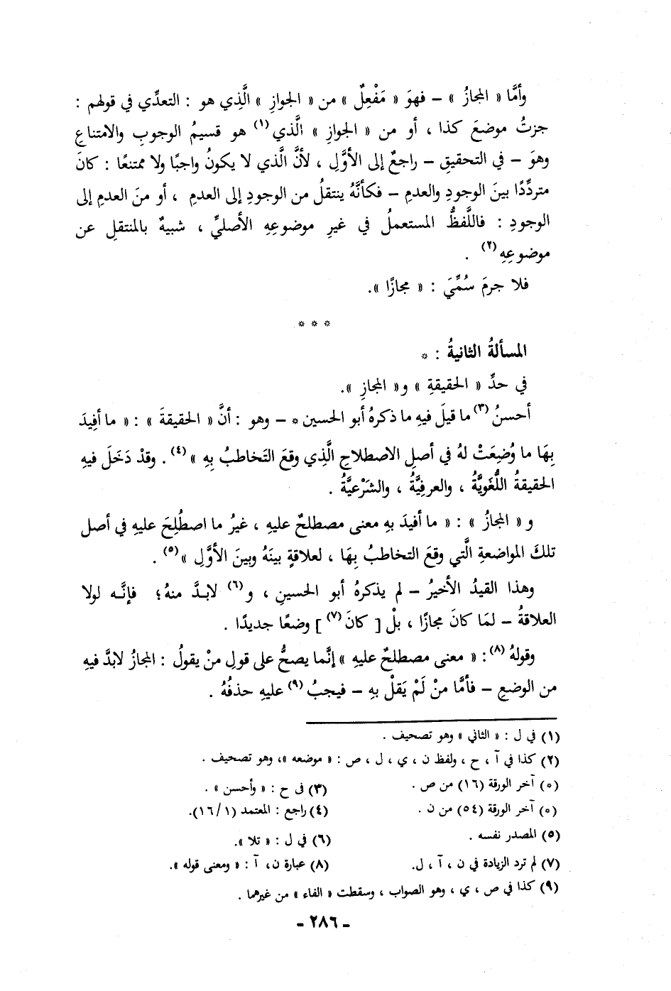 وأما المجاز فهو مفعل من الجواز الذي هو التعدي في قولهم جزت موضع كذا أو من الجواز الذي هو قسيم الوجوب والامتناع وهو في التحقيق راجع إلى الأول لأن الذي لا يكون واجبا ولا ممتنعا كان مترددا بين الوجود والعدم فكأنه ينتقل من الوجود إلى العدم أو من العدم إلى الوجود فاللفظ المستعمل في غير موضوعه الأصلي شبيه بالمنتقل عن موضوعه فلا جرم سمي مجازا المسألة الثانية