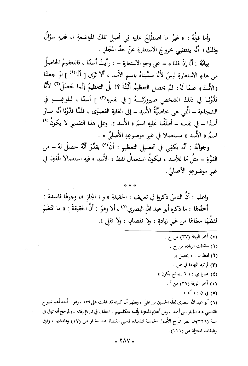 غير موضوعه الأصلي وأعلم أن الناس ذكروا في تعريف الحقيقة والمجاز وجوها فاسدة أحدها ما ذكره أبو عبد الله البصري ألا وهو أن الحقيقة ما انتظم لفظها معناها من غير زيادة ولا نقصان ولا نقل
