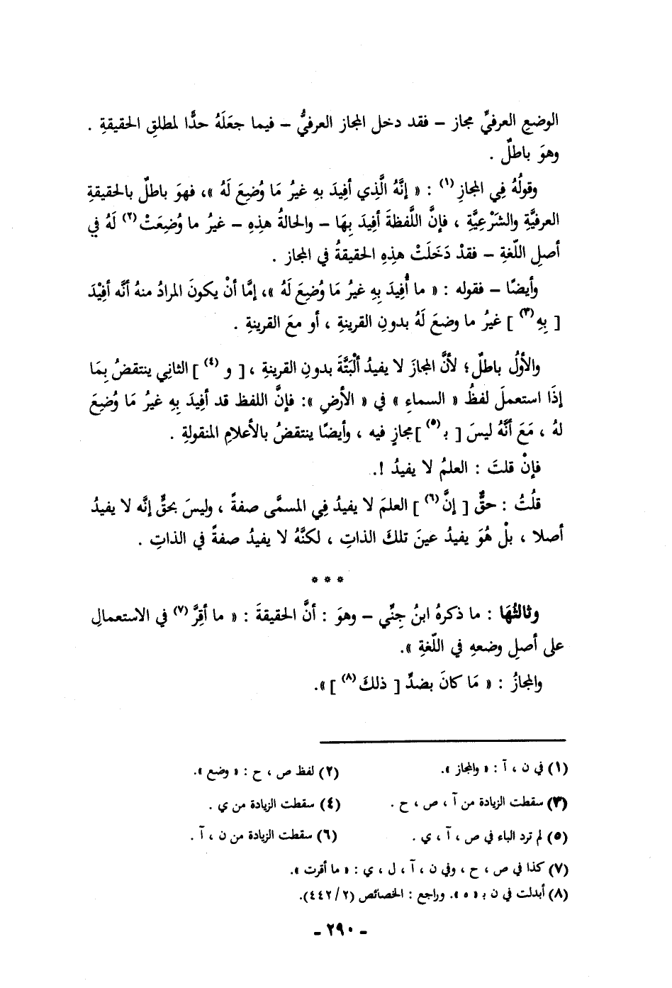 الوضع العرفي مجاز فقد دخل المجاز العرفي فيما جعله حدا لمطلق الحقيقة وهو باطل وقوله في المجاز إنه الذي أفيد به غير ما وضع له فهو باطل بالحقيقة العرفية والشرعية فإن اللفظة أفيد بها والحالة هذه غير ما وضعت له في أصل اللغة فقد دخلت هذه الحقيقة في المجاز وأيضا فقوله ما أفيد به غير ما وضع له إما أن يكون المراد منه أنه أفيد