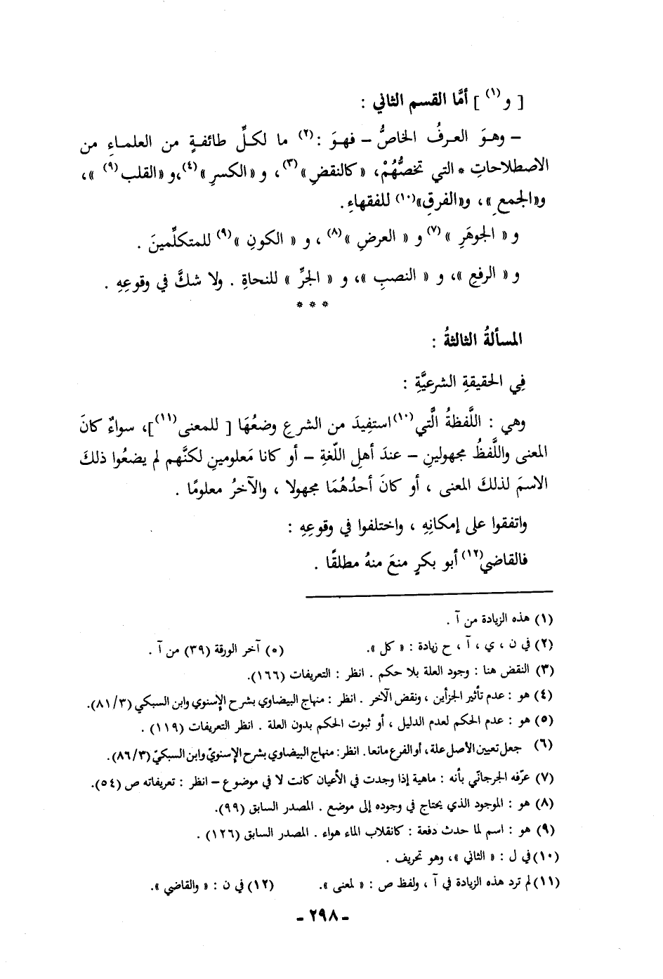وأما القسم الثاني وهو العرف الخاص فهو ما لكل طائفة من العلماء من الاصطلاحات التي تخصهم كالنقض والكسر والقلب والجمع والفرق للفقهاء والجوهر والعرض والكون للمتكلمين والرفع والنصب والجر للنحاة ولا شك في وقوعه المسألة الثالثة في الحقيقة الشرعية وهي اللفظة التي استفيد من الشرع وضعها للمعنى سواء كان المعنى واللفظ مجهولين عند أهل اللغة أو كانا معلومين لكنهم لم يضعوا ذلك الاسم لذلك المعنى أو كان أحدهما مجهولا والآخر معلوما واتفقوا على إمكانه واختلفوا في وقوعه