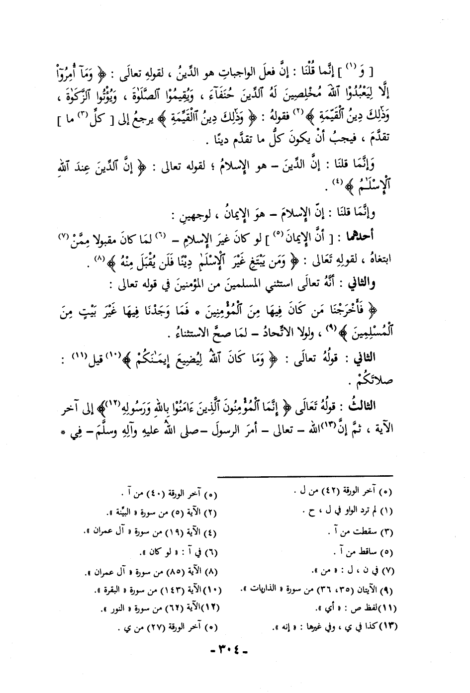 وإنما قلنا إن فعل الواجبات هو الدين لقوله تعالى وما أمروا إلا ليعبدوا الله مخلصين له الدين حنفاء ويقيموا الصلاة ويؤتوا الزكاة وذلك دين القيمة فقوله وذلك دين القيمة يرجع إلى كل ما تقدم فيجب أن يكون كل ما تقدم دينا وإنما قلنا إن الدين هو الإسلام لقوله تعالى إن الذين عند الله الإسلام وإنما قلنا إن الاسلام هو الايمان لوجهين أحدهما أن الايمان لو كان غير الاسلام لما كان مقبولا ممن ابتغاه لقوله تعالى ومن يبتغ غير الإسلام دينا فلن يقبل منه والثاني أنه تعالى استثنى المسلمين من المؤمنين في قوله تعالى فأخرجنا من كان فيها من المؤمنين فما وجدنا فيها غير بيت من المسلمين ولولا الاتحاد لما صح الاستثناء الثاني قوله تعالى وما كان الله ليضيع إيمانكم قيل صلاتكم الثالث قوله تعالى إنما المؤمنون الذين آمنوا بالله ورسوله إلى آخر الآية ثم إن الله تعالى أمر الرسول صلى الله عليه وسلم في