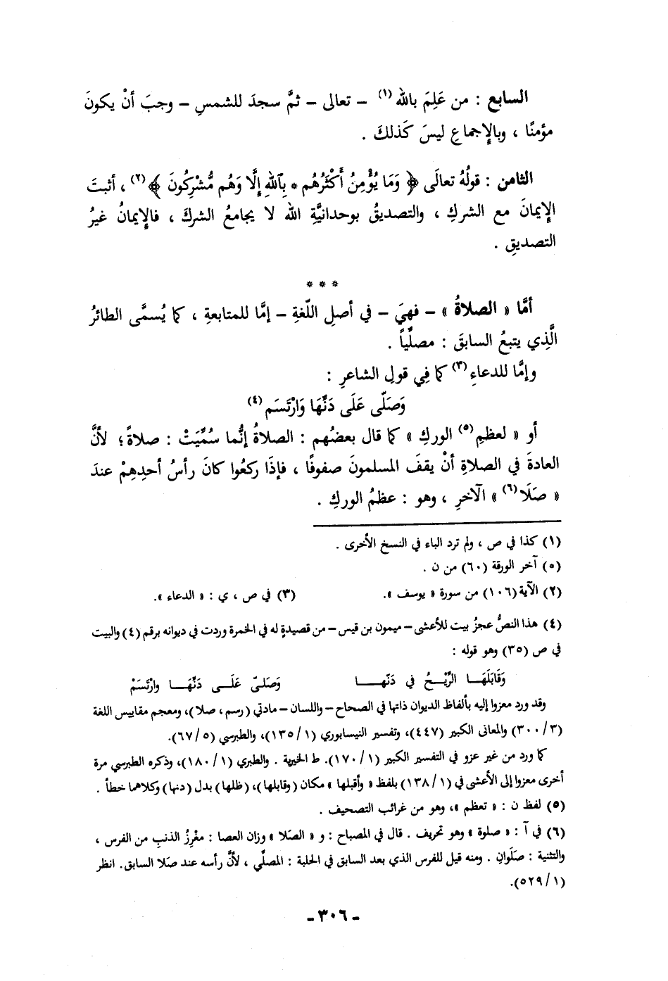 السابع من علم بالله تعالى ثم سجد للشمس وجب أن يكون مؤمنا وبالاجماع ليس كذلك الثامن قوله تعالى وما يؤمن أكثرهم بالله إلا وهم مشركون أثبت الايمان مع الشرك والتصديق بوحدانية الله لا يجامع الشرك فالايمان غير التصديق أما الصلاة فهي في أصل اللغة أما للمتابعة كما يسمى الطائر الذي يتبع السابق مصليا