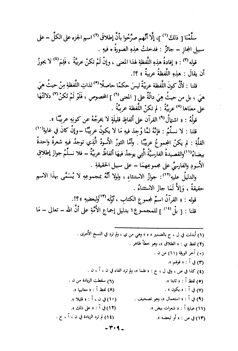 أن يقال هذه اللفظة عربية قلنا لأن كون اللفظة عربية ليس حكما حاصلا لذات اللفظة من حيث هي هي بل حيث هي دالة على المعنى المخصوص فلو لم تكن دلالتها على معناها عربية لم تكن اللفظة عربية قوله اشتمال القرآن على ألفاظ قليلة لا يخرجه عن كونه عربيا قلنا لا نسلم فإنه لما وجد فيه ما لا يكون عربيا وان كان في غاية القلة لم يكن المجموع عربيا وأما الثور الأسود الذي توجد فيه شعرة واحدة بيضاء والقصيدة الفارسية التي يوجد فيها ألفاظ عربية فلا نسلم جواز اطلاق الأسود والفارسي على مجموعهما على سبيل الحقيقة والدليل عليه جواز الاستثناء ولولا أنه يمجموعه رسول لا يسمى بهذا الاسم حقيقة وإلا لما جاز الاستثناء قوله القرآن اسم لمجموع الكتاب أوله ولبعضه قلنا بل للمجموع بدليل إجماع الأمة على أن الله تعالى ما