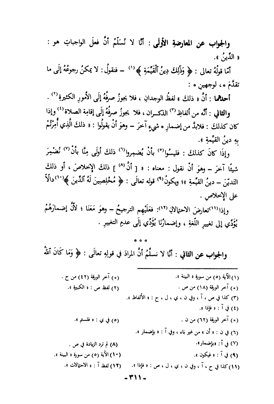 والجواب عن المعارضة الأولى أنا لا نسلم أن فعل الواجبات هو الدين أما قوله تعالى وذلك دين القيمة فنقول لا يمكن رجوعه إلى ما تقدم لوجهين أحدهما أن ذلك لفظ الوجدان فلا يجوز صرفه إلى الأمور الكثيرة والثاني أنه من ألفاظ الذكران فلا يجوز صرفه إلى إقامة الصلاة وإذا كان كذلك فلا بد من إضمار شئ آخر وهو أن يقولوا ذلك الذي أمرتم به دين القيمة وإذا كان كذلك فليسوا بأن يضمروا ذلك أولى منا بأن نضمر شيئا آخر وهو أن نقول معناه أن ذلك الاخلاص أو ذلك التدين دين القيمة ويكون قوله تعالى مخلصين له الدين دالا