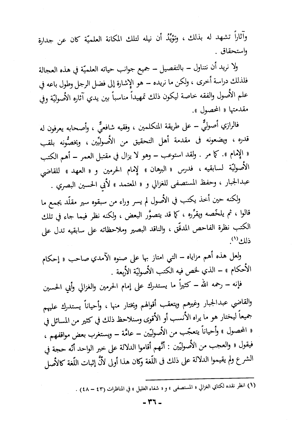 ولا نريد أن نتاول - بالتفصيل - جميع جوانب حياته العلمية في هذه العجالة فلذلك دراسة أخرى، ولكن ما نريده - هو الاشارة إلى فضل الرجل وطول باعه في علم الاصول والفقه خاصة ليكون ذلك تمهيدا مناسبا بين يدي آثاره الاصولية وفي مقدمتها " المحصول ".