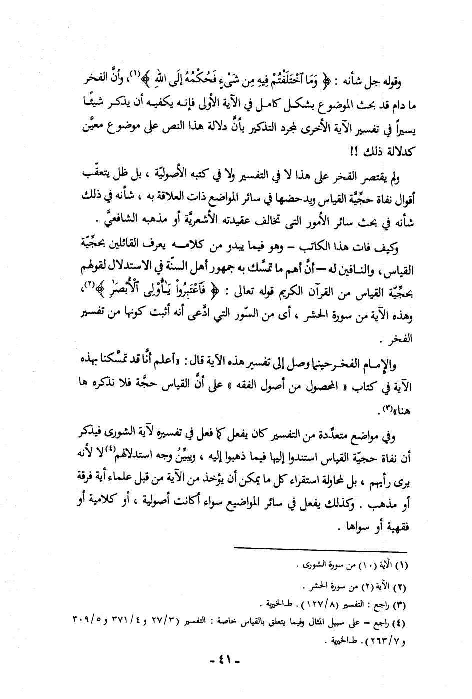 وقوله جل شأنه: (وما اختلفتم فيه من شئ فحكمه إلى الله) ، وأن الفخر ما دام قد بحث الموضوع بشكل كامل في الآية الأولى فإنه يكفيه أن يذكر شيئا يسيرا في تفسير الاية الاخرى لمجرد التذكير بأن دلالة هذا النص على موضوع معين كدلالة ذلك! ! ولم يقتصر على هذا لا في التفسير ولا في كتبه الاصولية، بل ظل يتعقب أقوال نفاة حجية القياس ويد حضها في سائر المواضع ذات العلاقة به، شأنه في ذلك شأنه في بحث سائر الامور تخالف عقيدته الاشعرية أو مذهبه الشافعي.