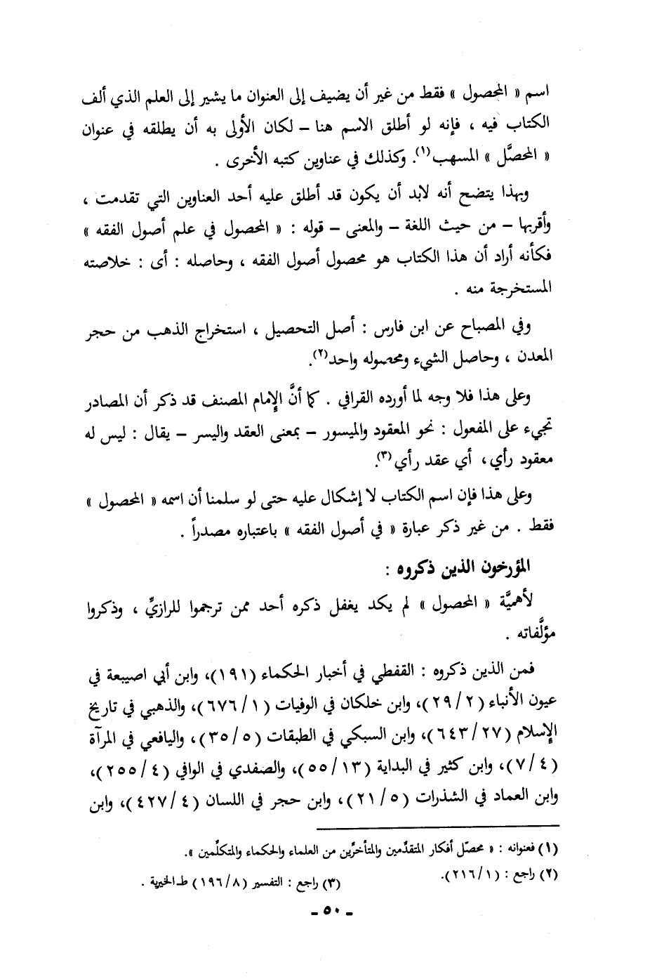 اسم المحصول فقط من غير أن يضيف إلى العنوان ما يشير إلى العلم الذي ألف الكتاب فيه، فإنه لو أطلق الاسم هنا - لكان الاولى به أن يطلقه في عنوان " المحصل " المسهب.