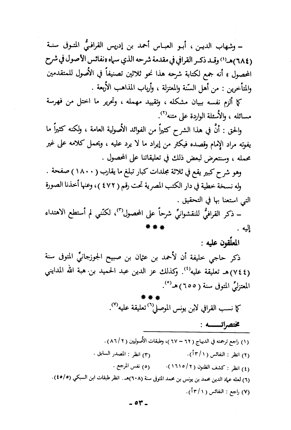 - وشهاب الدين، أبو العباس أحمد بن إدريس القرافي المتوفى سنة هـ وقد ذكر القرافي في مقدمة شرحه الذي سماه " نفائس الاصول في شرح المحصول " أنه جمع لكتابة شرحه هذا نحو ثلاثين تصنيفا في الاصول للمتقدمين والمتأخرين: من أهل السنة والمعتزلة، وأرباب المذاهب الاربعة.