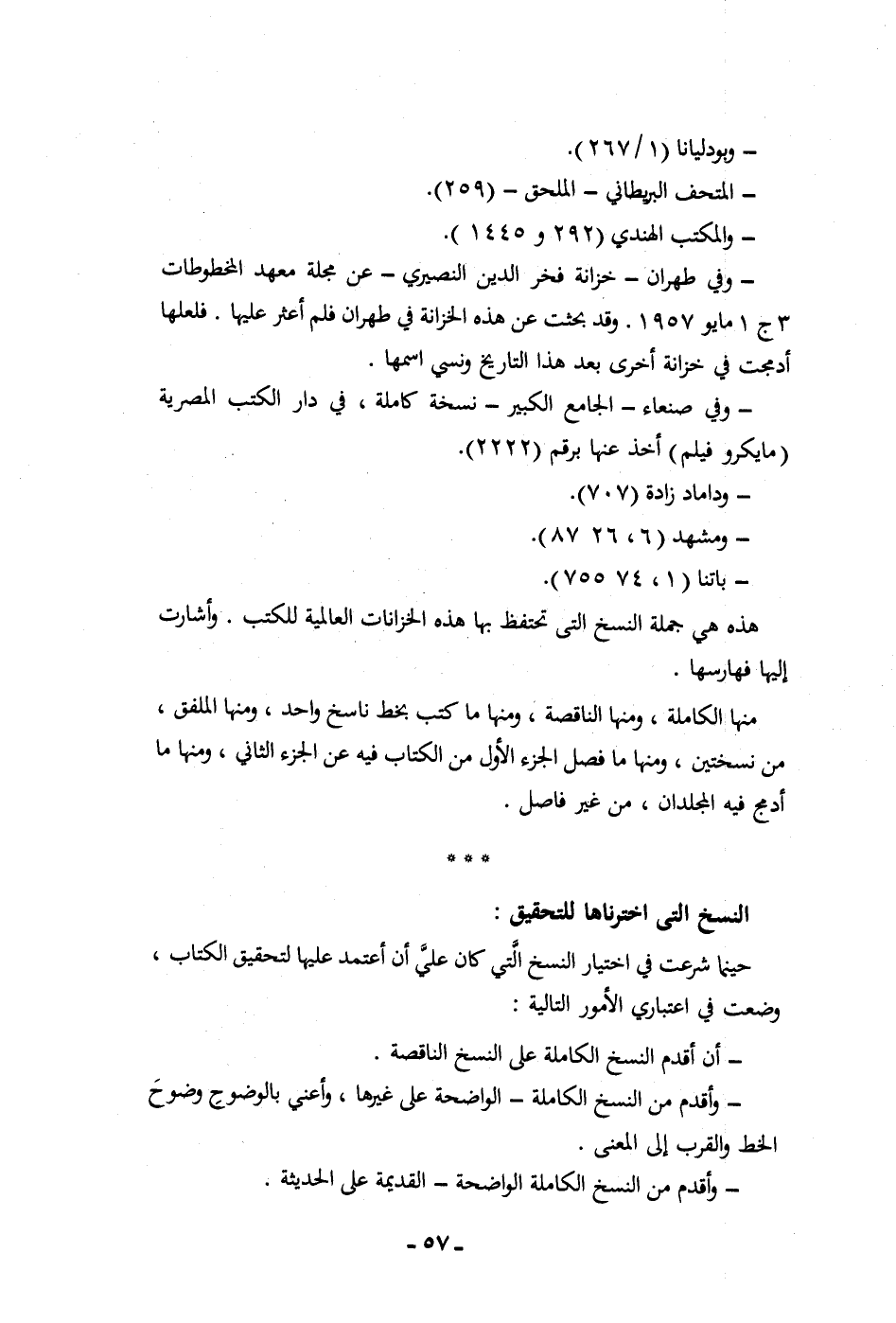النسخ التى اخترناها للتحقيق: حينما شرعت في اختيار النسخ التى كان علي أن اعتمد عليها لتحقيق الكتاب، وضعت في اعتباري الامور التالية: - أن أقدم النسخ الكاملة على النسخ الناقصة.
