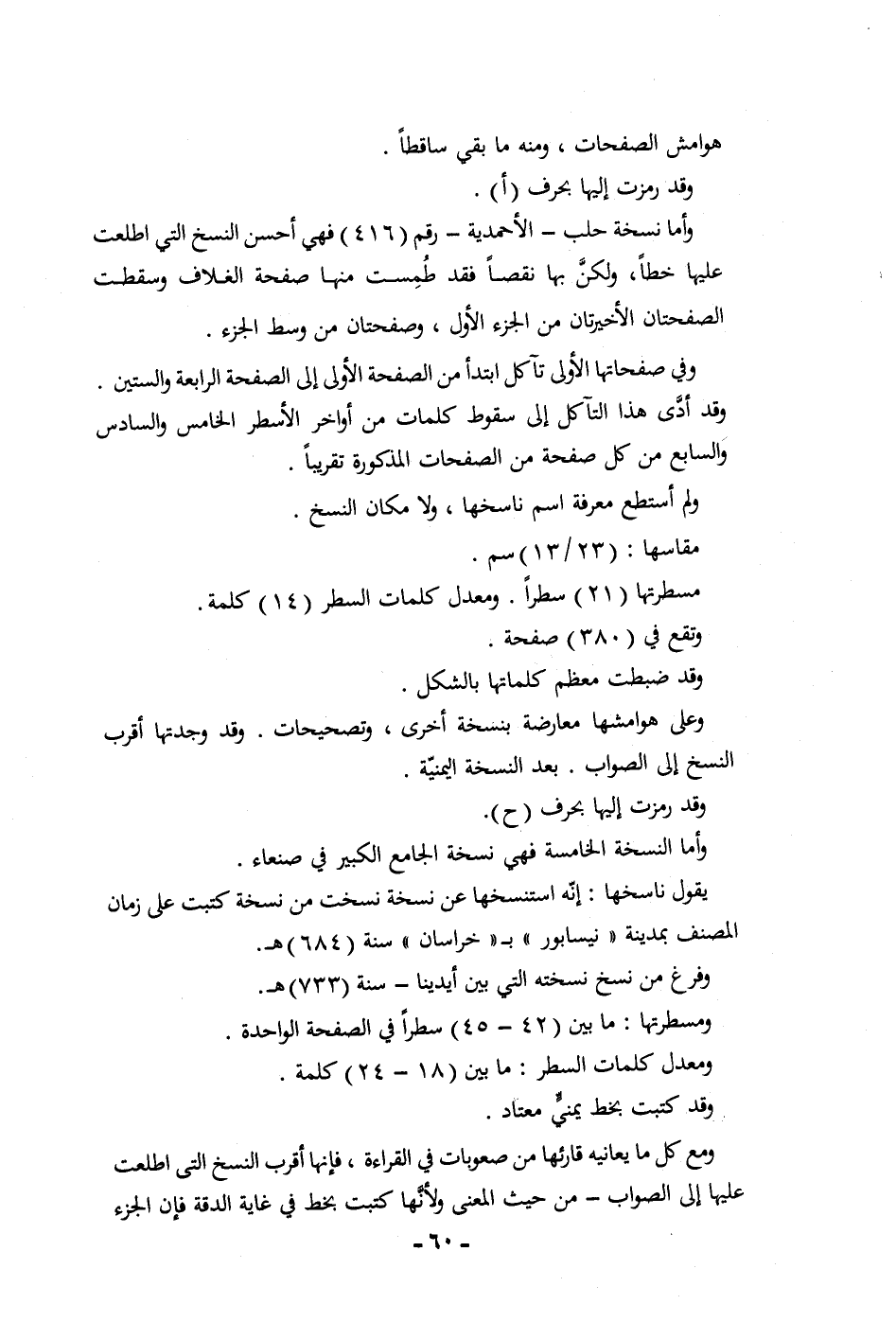وأما نسخة حلب - الاحمدية) رقم فهي أحسن النسخ التي اطلع عليها خطا، ولكن بها نقصا فقد طمست منها صفة الغلاف وسقطت الصفحتان الاخيرتان من الجزء الاول، وصفحتان من وسط الجزء.