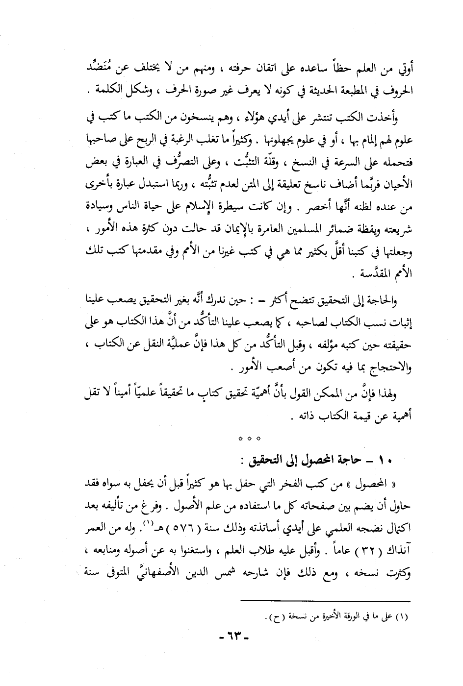10 - حاجة المحصول إلى التحقيق: " المحصول " من كتب الفخر التي حفل بها هو كثيرا قبل أن يحفل به سواه فقد حاول أن يضم بين صفحاته كل ما استفاده من علم الاصول.