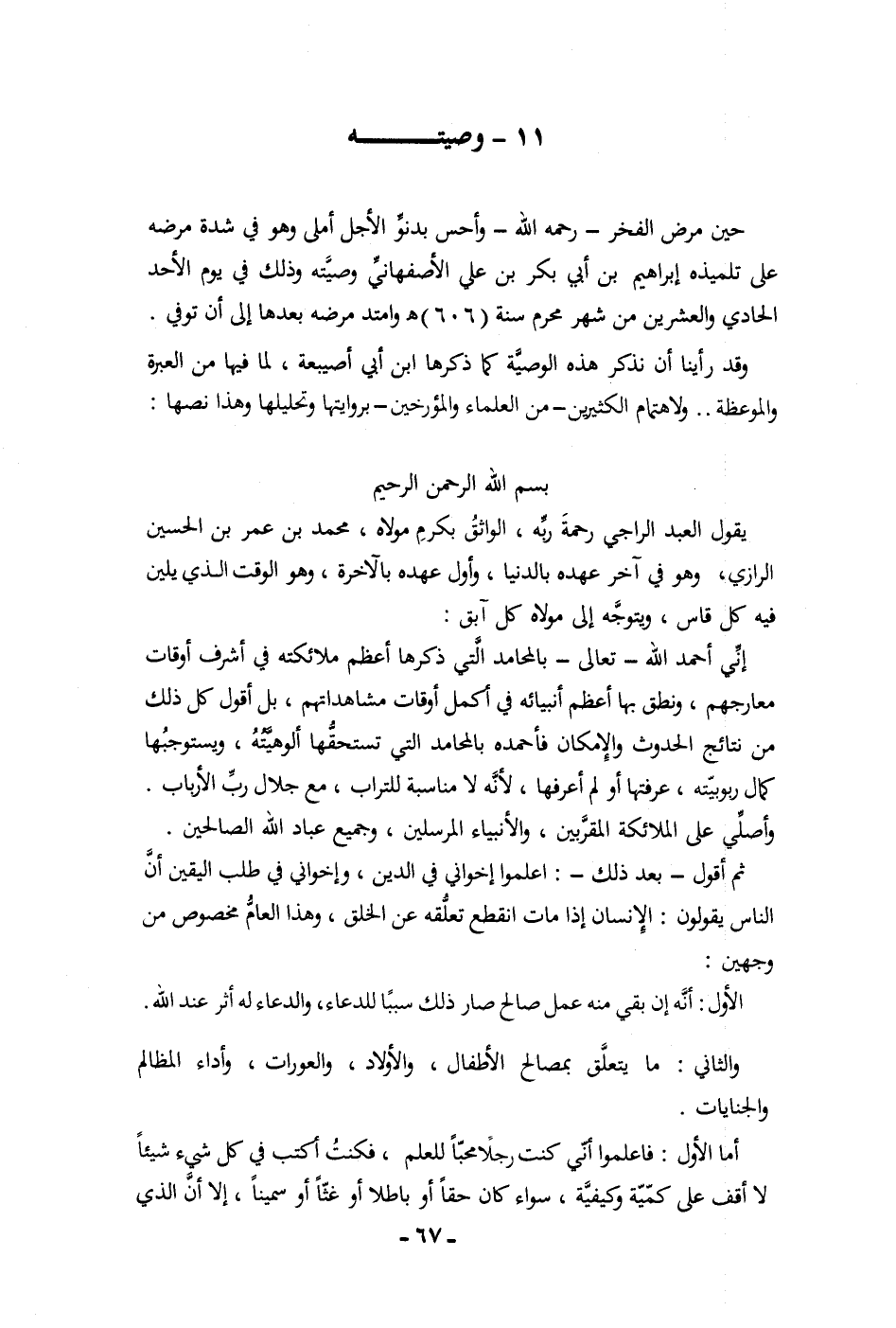 11 - وصيته حين مرض الفخر - رحمه الله - وأحسن بدنو الاجل أملى وهو في شدة مرضه على تلميذه إبراهيم بن أبي بكر بن علي الاصفهاني وصيته وذلك في يوم الاحد الحادي والعشرين من شهر محرم سنة هـ وامتد مرضه بعدها إلى أن توفي.
