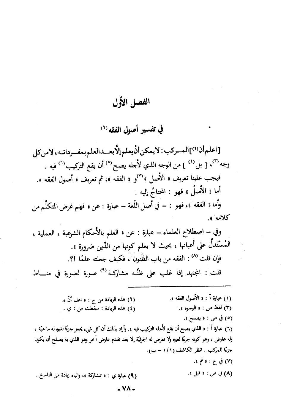 الفصل الأول في تفسير أصول الفقه (اعلم أن) المركب لا يمكن أن يعلم إلا بعد العلم بمفرداته لا من كل وجه بل من الوجه الذي لأجله يصح أن يقع التركيب فيه فيجب علينا تعريف الأصل والفقه ثم تعريف أصول الفقه أما الأصل فهو المحتاج إليه وأما الفقه فهو في أصل اللغة عبارة عن فهم غرض المتكلم من كلامه وفي اصطلاح العلماء عبارة عن العلم بالأحكام الشرعية العملية والمستدل على أعيانها بحيث لا يعلم كونها من الدين ضرورة