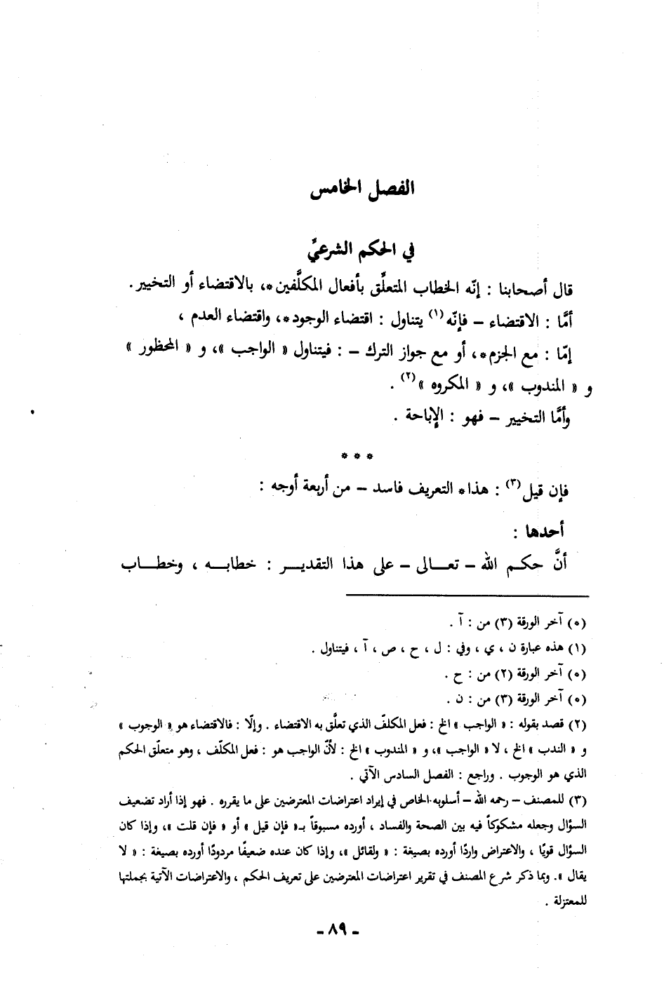 الفصل الخامس في الحكم الشرعي قال أصحابنا إنه الخطاب المتعلق بأفعال المكلفين بالإقتضاء أو التخيير أما الإقتضاء فإنه يتناول اقتضاء الوجود واقتضاء العدم إما مع الجزم أو مع جواز الترك فيتناول الواجب والمحظور والمندوب والمكروه وأما التخيير فهو الإباحة فإن قيل هذا التعريف فاسد من أربعة أوجه أحدهما أن حكم الله تعالى على هذا التقدير خطابه وخطاب