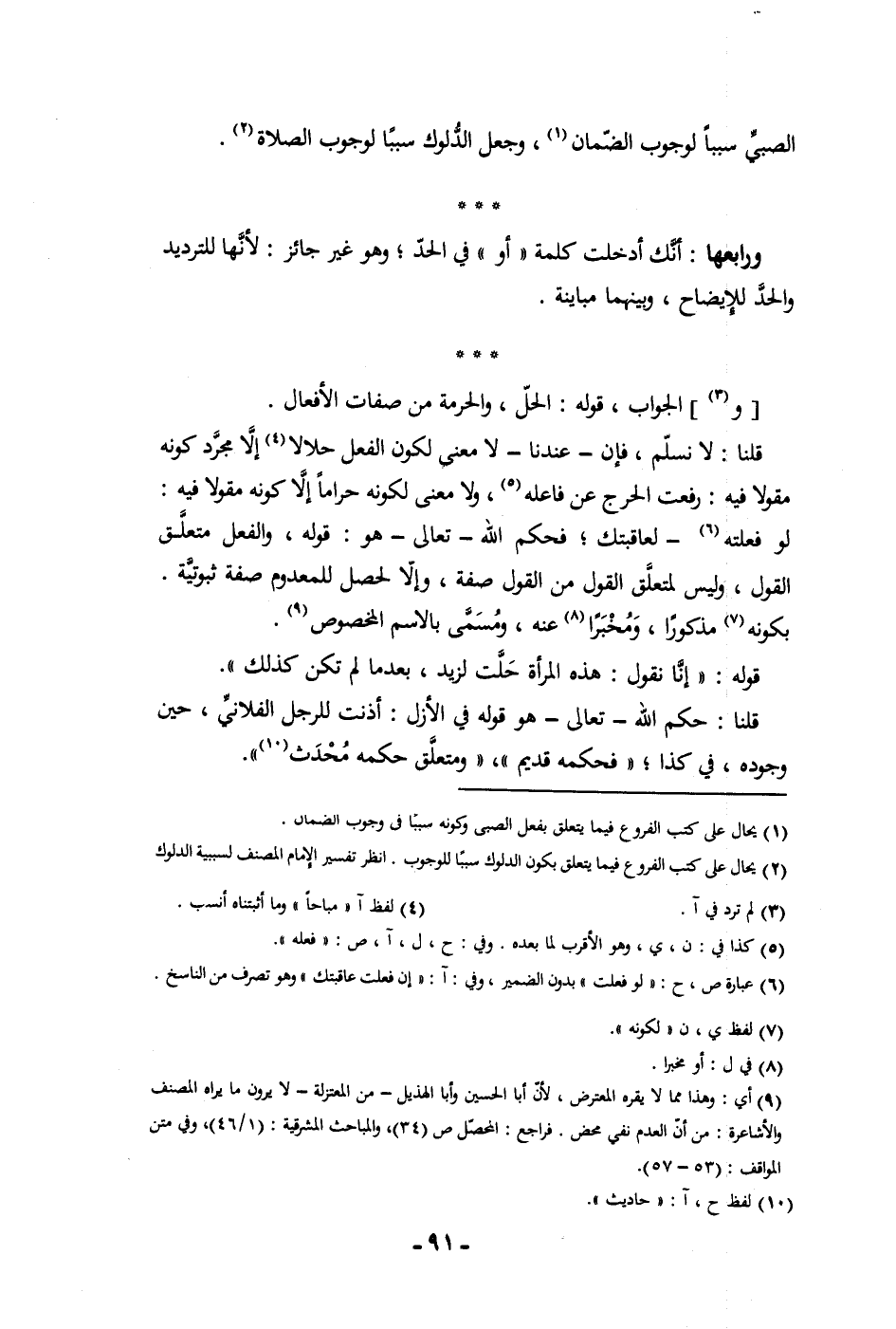 الصبي سببا لوجوب الضمان وجعل الدلوك سببا لوجوب الصلاة ورابعها أنك أدخلت كلمة أو في الحد وهو غير جائز لأنها للترديد والحد للإيضاح وبينهما مباينة والجواب قوله الحل والحرمة من صفات الأفعال قلنا لا نسلم فإن عندنا لا معنى لكون الفعل حلالا إلا مجرد كونه مقولا فيه رفعت الحرج عن فاعله ولا معنى لكونه حراما إلا كونه مقولا فيه لو فعلته لعاقبتك فحكم الله تعالى هو قوله والفعل متعلق