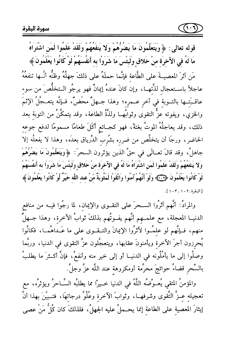 قوله تعالى: (وَيَتَعَلَّمُونَ مَا يَضُرُّهُمْ وَلَا يَنْفَعُهُمْ وَلَقَدْ عَلِمُوا لَمَنِ اشْتَرَاهُ مَا لَهُ فِي الْآخِرَةِ مِنْ خَلَاقٍ وَلَبِئْسَ مَا شَرَوْا بِهِ أَنْفُسَهُمْ لَوْ كَانُوا يَعْلَمُونَ (102)