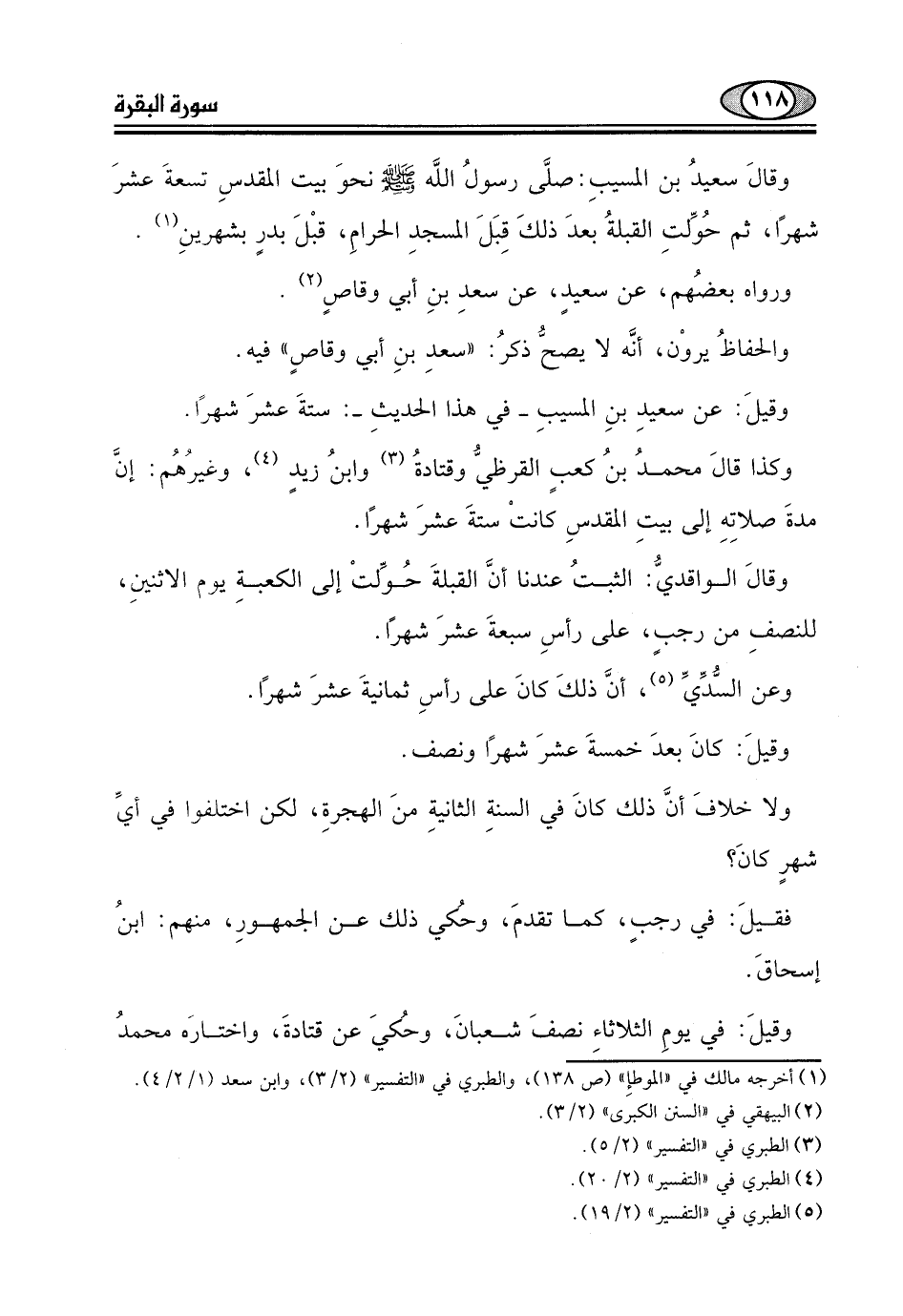 وقالَ سعيدُ بن المسيبِ: صلَّى رسولُ اللَّه - صلى الله عليه وسلم - نحوَ بيت المقدسِ تسعةَ عشرَ شهرًا، ثم حُوِّلتِ القبلةُ بعدَ ذلكَ قِبَلَ المسجدِ الحرامِ، قبْلَ بدرٍ بشهرينِ.