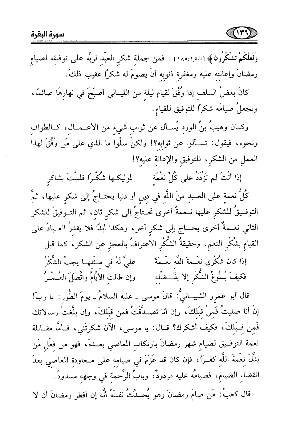 قال: يا موسى، الَآنَ شكرتَني، فأمَّا مقابلة نعمة التوفيق لصيامِ شهر رمضانَ بارتكابِ المعاصي بعده، فهو من فِعْلِ مَن بدَّلَ نِعْمةَ اللَّهِ كفرًا، فإن كان قد عَزَمَ في صيامِهِ على معاودةِ المعاصِي بعدَ انقضاءِ الصيامِ، فصيامُه عليه مردودٌ، وبابُ ألرَّحمةِ في وجههِ مسدودٌ.
