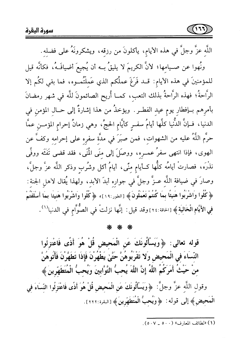فمن صبَرَ في مدَّةِ سفرِهِ على إحرامِهِ وكفَّ عن الهوى، فإذا انتهى سفرُ عمى، ووصَلَ إلى مِنَى المُنَى، فقد قضى تَفَثَه ووفَّى نذْرَه، فصارتْ أيامُه كلُّها كأيامِ مِنًى، أيامُ أكل وشُربٍ وذكر اللَّه عزَّ وجلَّ.