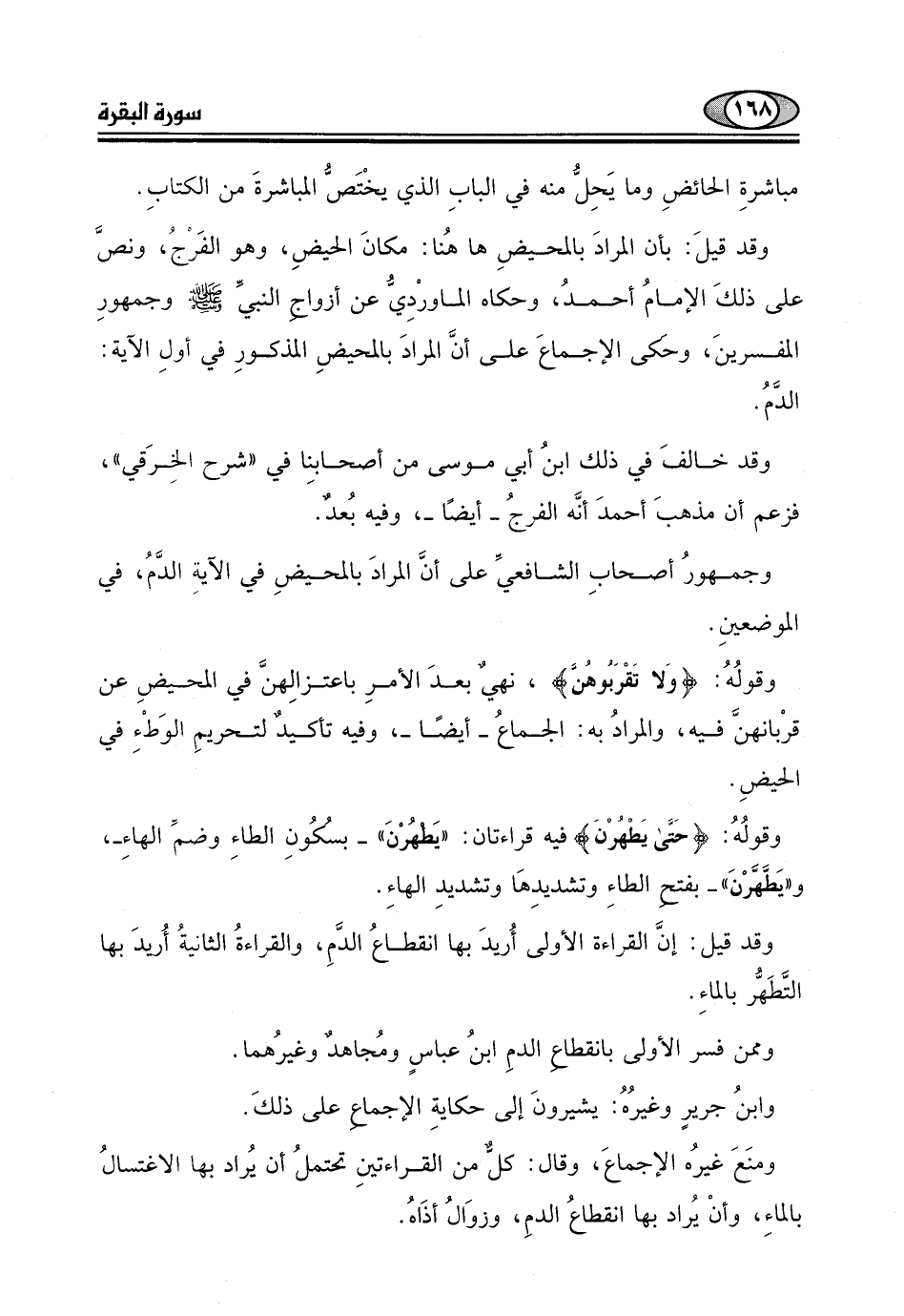وقولُهُ: (حَتَّى يَطْهُرْنَ) فيه قراءتان: "يَطهُرْنَ " - بسكُونِ الطاءِ وضمَ الهاءِ -، و"يَطَّهَّرْنَ " - بفتح الطاءِ وتشديدِهَا وتشديدِ الهاءِ.